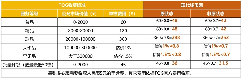 由于網(wǎng)站增加了原包裝拆封、錢幣原狀態(tài)認(rèn)定、評(píng)級(jí)甄選、數(shù)據(jù)錄入與存儲(chǔ)、系統(tǒng)開(kāi)發(fā)維護(hù)等工作,所以除了按照評(píng)級(jí)公司標(biāo)準(zhǔn)收費(fèi)之外,對(duì)于珍稀錢幣需要收取原狀態(tài)評(píng)估費(fèi)。