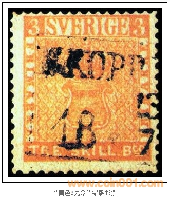 這枚原本應(yīng)為3先令的“黃色3先令”錯版郵票是瑞典1855年印刷的,首次使用是在1857年。正常的3先令郵票當(dāng)時(shí)應(yīng)為綠色,但這枚郵票被錯印刷成了黃色,而黃色是當(dāng)時(shí)8先令郵票的顏色。1996年,該枚郵票曾以200萬美元的高價(jià)被拍賣過一次。