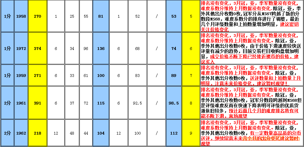 難度系數是動態的,評級量上升不管他是冠軍還是亞軍難度系數的分數一定會提高,總量上升是必然的,關鍵是看各個分數段有沒有上升(尤其是高分段)有時低分多不一定是壞事反而能襯托高分的稀缺性。如果某些品種的評級已經接近飽和那他的難度系數分數就不會上升隨著時間的推移他的價值同樣能體現出來!如果現在價格合適的話對于您來說的那個品種也許是最佳的買入時機。