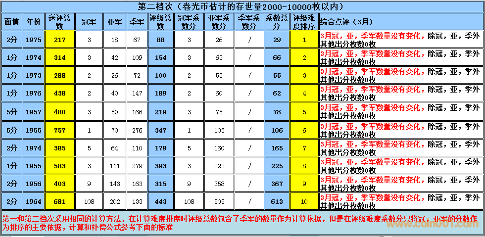 第二檔次(卷光幣估計的存世量2000-10000枚以內,冠,亞,季的評級難度系數范圍5000以內)