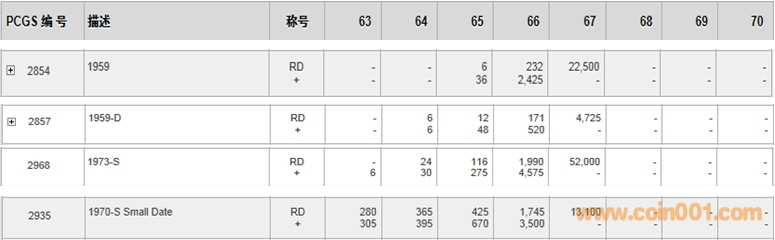 以下是從PCGS官網隨機采集的部分數據,年份為195919701973年半美分,首先要非常感謝PCGS他們給我們提供了非常全面的評級數據和價格體系,通過觀察這些數據使我收獲頗豐