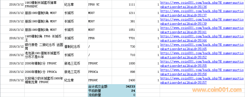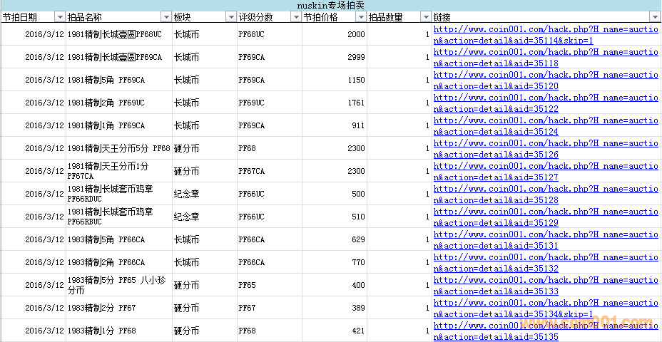 nuskin專場拍賣在2016-3-12晚上21:00正式開始,拍品主要涵蓋長城幣、硬分幣、紀念章、新老三花幣、普制長城幣5個板塊,本次拍賣一個有24項拍品上拍,最終成交24項,成交率100%,成交總金額34233元。此次專場拍賣精制套裝硬幣成為熱點,無論從上拍數量還是成交額都占據專場拍賣的絕對主導地位,成交非常火爆。 專場拍賣的重點為長城幣板塊,成交總金額21274元,占總成交額的62%,上拍的12枚拍品全部成交,包含普制長城幣和精制長城幣。從拍賣結果看,精制長城幣的節拍價格令人振奮,節拍價格普遍要高于市場預期,其中PF66 1985精制2角的競拍非常激烈,一共有7位會員參與了競拍,最終以7701元成交,節拍價格超越了現代網最新報價,漲幅達到10%。1981年精制長城幣的節拍價格也普遍高于市場預期,PF69CA1981精制長城壹圓最終以一口價2999成交,漲幅達到20%以上,節拍價格創出了近3年新高。其余幾枚精制長城幣的節拍價格也出現了不同程度的上漲,漲幅達到10-30%不等。 紀念章板塊,有4枚精制紀念章上拍,其中冠軍分PF69UC 1988年精制龍章競價過程非常激烈,一共有9位會員參與了競拍,最終以2400元成交,節拍價格離賣家設置的一口價非常接近顯示買家志在必得。PF68RDUC 1983精制長城套幣豬章競價過程異常激烈,一共有7位會員參與了競拍,最終以1111元高價成交,節拍價格超越了現代網的最新報價,漲幅達到驚人的70%,受到精制豬章高價成交的帶動2枚精制雞章的節拍價格也出現了20%的上升。 硬分幣板塊,有5枚精制分幣上拍,競價過程比較活躍,從節拍價格看基本符合市場的預期。 在總共上拍的24項拍品中,評級幣占到了22項,占總金額98%,評級幣占據這次專場拍賣的主導地位。 以下是詳細的成交統計: [ 此帖被202yi在2016-03-14 15:56重新編輯 ]
