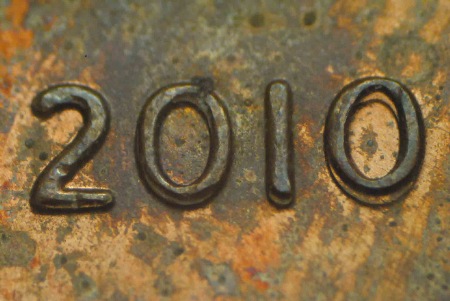 以下照片顯示出 2010 年林肯分幣上的機(jī)械復(fù)打。在 LIBERTY 和日期上,可見到典型的平展、條板狀復(fù)打印記,因?yàn)樗鼈冊(cè)趲琶嫔鲜峭怀龅脑O(shè)計(jì)成分。在設(shè)計(jì)師姓名的首字母上,可以見到明顯的重影,看起來就像重模現(xiàn)象。但是設(shè)計(jì)師姓名的首字母是凹陷的,因此這也是機(jī)械復(fù)打。