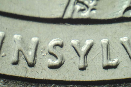 許多現(xiàn)代錢幣,如壯麗美國(guó)(America The Beautiful)25美分銀幣,都有凹陷的設(shè)計(jì)成分。在這些25美分硬幣的正面,幣邊附近的字母是凹陷的。當(dāng)這些凹陷的設(shè)計(jì)成分出現(xiàn)重影時(shí),基本上全部都是機(jī)械復(fù)打。以下照片顯示出 2011-P 賓夕法尼亞葛底斯堡25美分硬幣幣邊附近的凹陷字母上發(fā)生的機(jī)械復(fù)打。