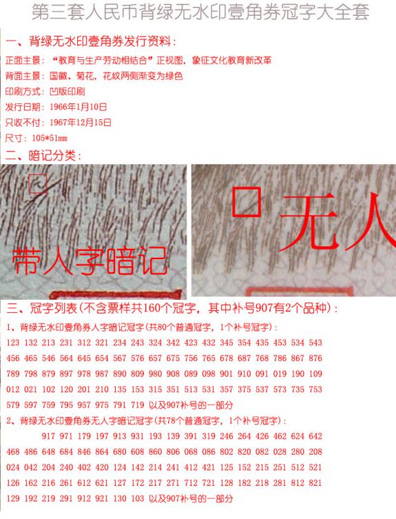 第三套人民幣棗紅壹角、背綠/背綠水印壹角、紅三凹壹角冠字組大全