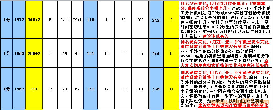評(píng)級(jí)的精髓就是稀缺性,高分越少相應(yīng)的難度系數(shù)就越高,關(guān)于這個(gè)計(jì)算公式我是通過(guò)深思熟慮考慮到了各種的可能性,這個(gè)計(jì)算公式我認(rèn)為同樣可以與其他品種的評(píng)級(jí)幣進(jìn)行橫向的比較我個(gè)人比較看好早期分幣的難度系數(shù)!我個(gè)人認(rèn)為在未來(lái)10年內(nèi)除了幣的本身價(jià)值外,任何品種的評(píng)級(jí)幣難度系數(shù)分?jǐn)?shù)越低其價(jià)值就越高,這也可以理解為評(píng)級(jí)除了保護(hù)錢幣狀態(tài)屬性外另外的一個(gè)精髓所在,大家可以依據(jù)上面提供的數(shù)據(jù)和結(jié)合卷光分幣原始鑄造紋相同的特點(diǎn)可以進(jìn)行綜合研究和科學(xué)的分析(這里主要是針對(duì)卷光的硬幣,排除不正確的清洗破壞了幣的原始出廠狀態(tài)的硬幣)