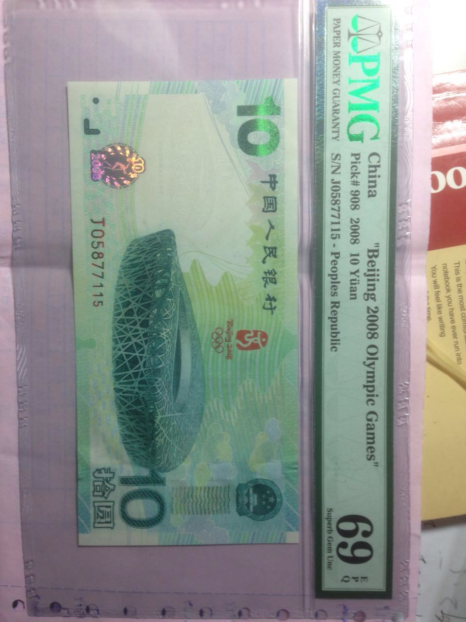 話說回來,如果說這枚69分的和我之前評66分的區別,我感覺還是不甚了了。唯一看得出來的是69分這張確實很干凈,紙面很白;而66分的相較之下是有些黃了(這還是我在入盒之前自己比較過的,入盒后兩者的顏色區別就幾乎看不出來)。但我聽說,紙鈔對圖案的工整、對稱什么的也非常重視,而當時我看這張奧運的金屬線明顯比其他偏離了,難道這不是扣分項嗎?