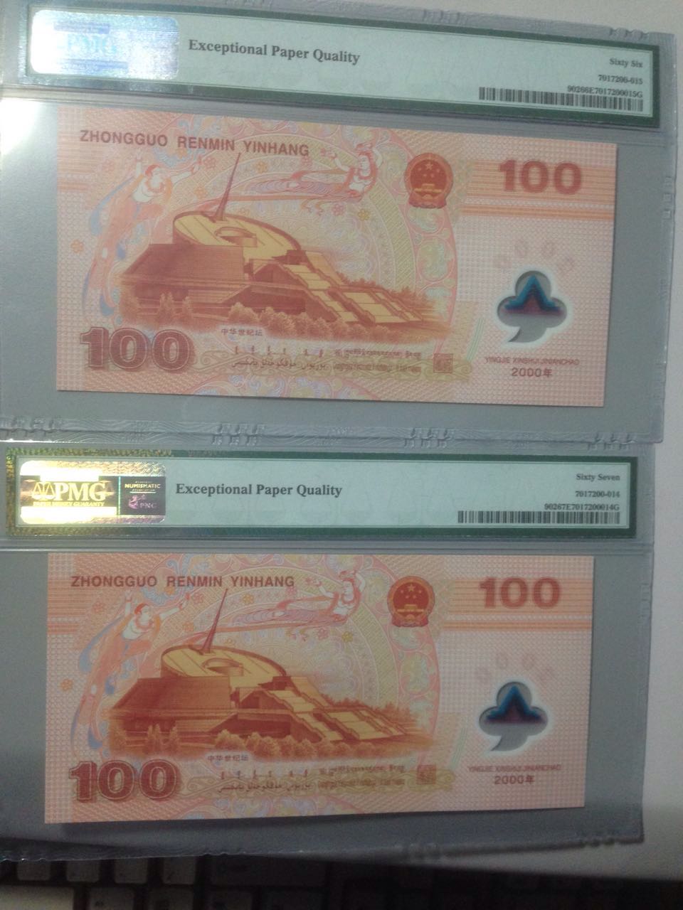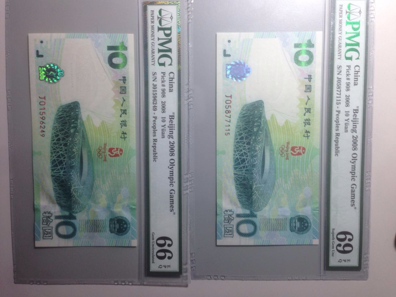 第一個問題:由于PMG紙幣評級標準產生了變化,您的2張奧運鈔恰巧在評級標準前后。
