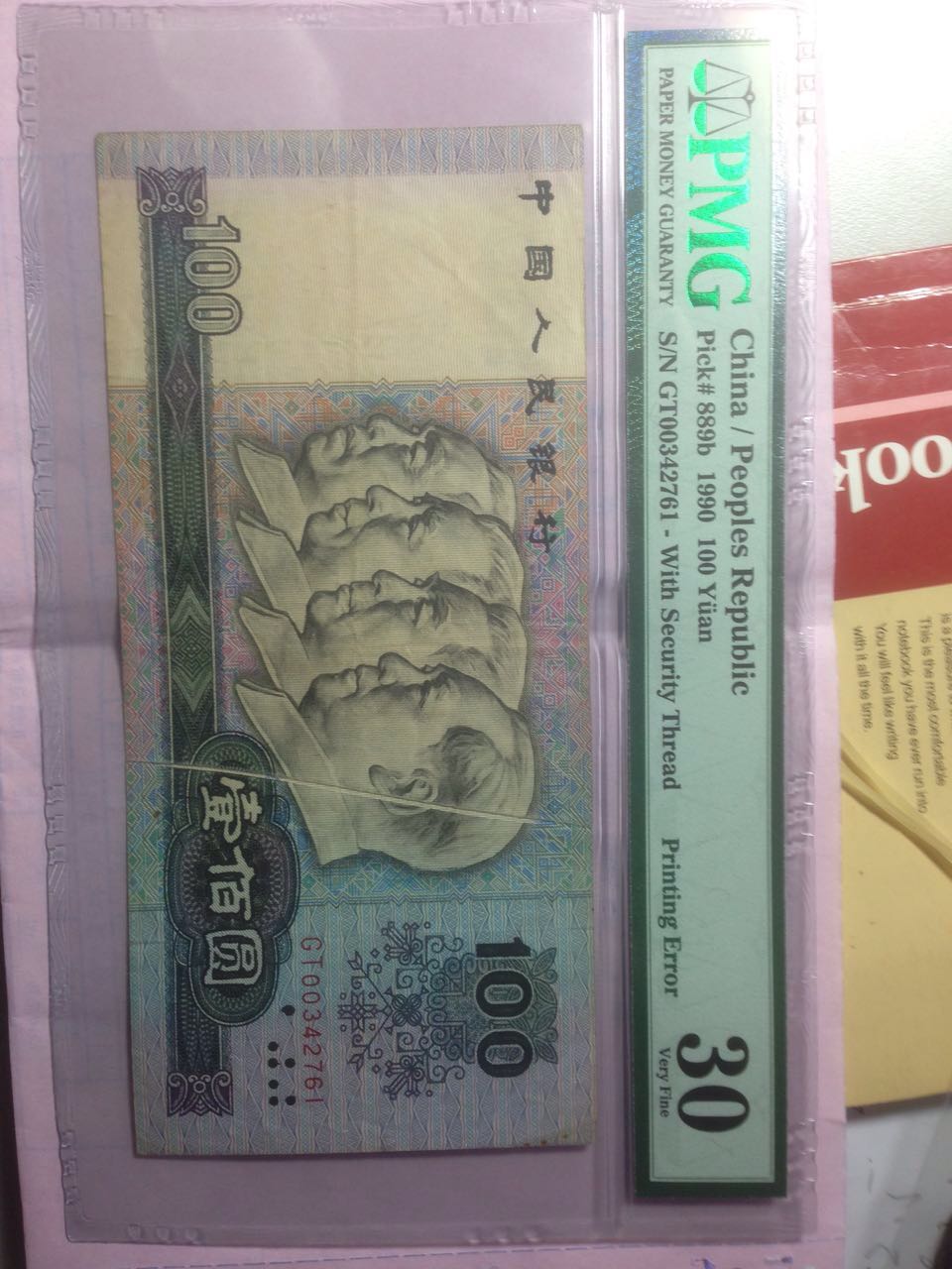 最后一張是一枚趣味品,四版90100,中間有折白,而且穿主席耳朵而過。我這張鈔票之所以送評,就是希望得個權威認證,證明不是人為后天加工的、而確是有瑕疵的真品(之前聽說PMG對這類紙鈔不入盒?)。這張是流通品,確是多年前銀行老柜員在大量過手的現金里淘出來的特殊一張。我不懂這種紙鈔的價值,現在就想問問各位達人,像這樣評級認證過的所謂錯幣,有收藏價值嗎(有種說法是瑕疵幣,無價值應該回收作廢)?如果轉讓,定價以什么作為參照比價好呢?