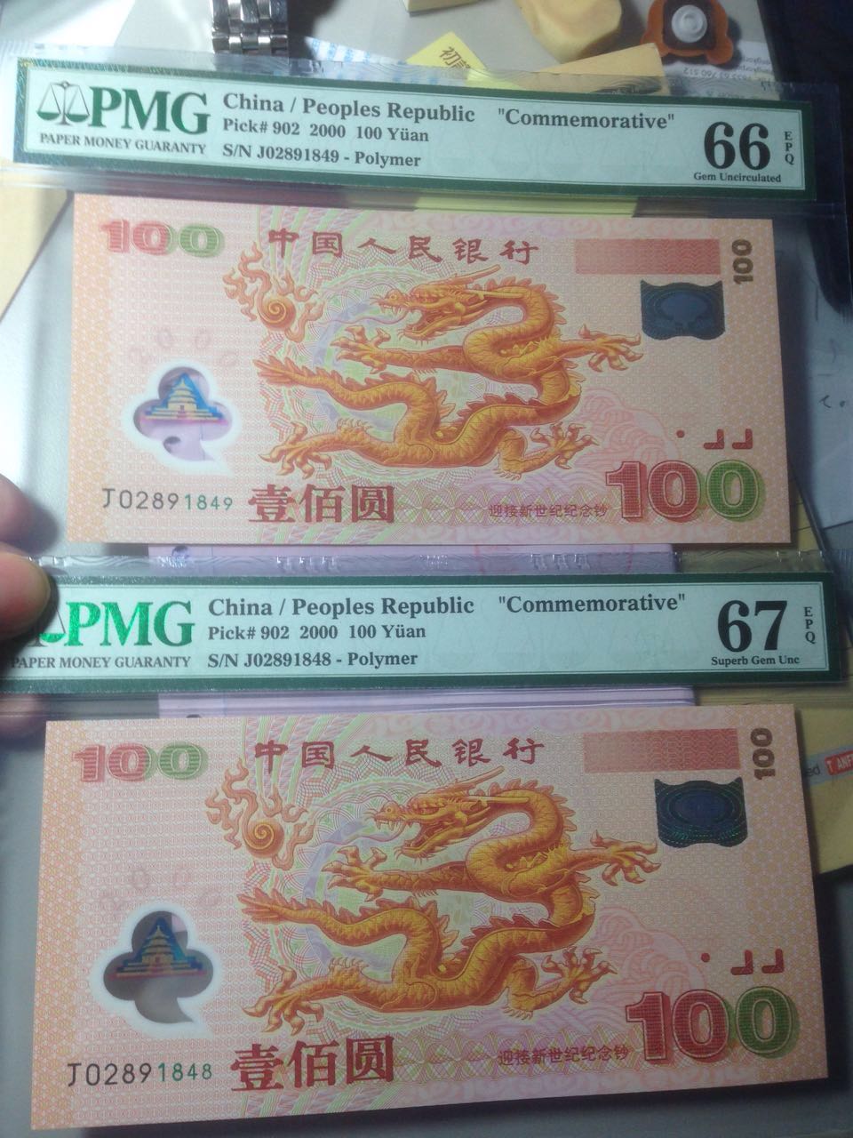 送評的另外兩張是龍鈔,兩張是連號、我自己小心收藏多年的好品。東西沒送評之前,我自己仔細品評了一下,無論色澤、平整度、對稱情況等等,我覺得完全沒有區別,除了號碼以外根本看不出來有何不同;或者換種方式,只對兩鈔非號碼一面進行品鑒,稍微打亂一下我就連哪張是哪張都分不清楚了。——然而,就是這樣的兩張紀念鈔,評級結果出來是一個66、一個67,這讓我十分困惑!至于為什么扣去的幾分,那就更加是云里霧里了。——還請泉友提點,兩張不同的分紙鈔的區別、扣分點在哪里呢?
