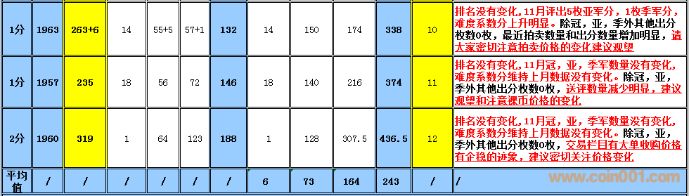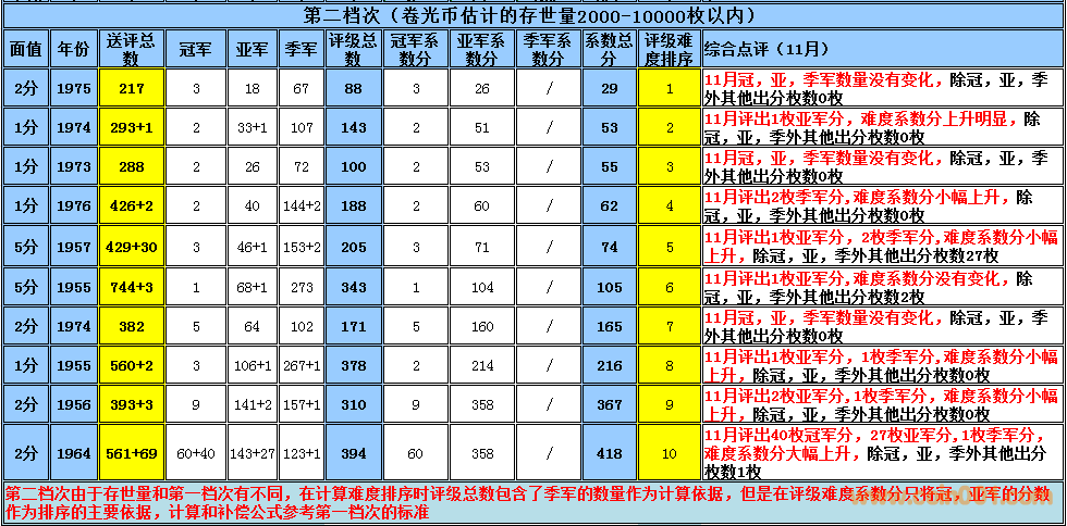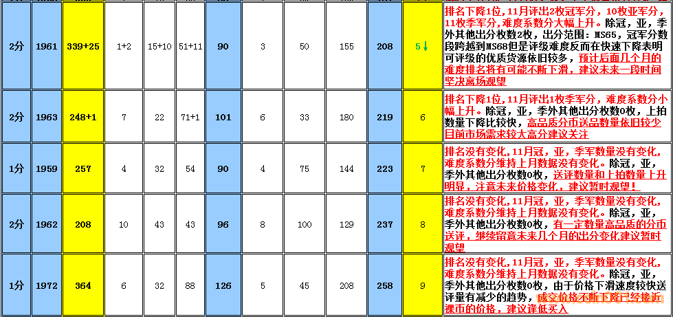 采樣的范圍 第一檔次(卷光幣估計的存世量1-2000枚以內,難度系數分2000以內) 1956年1分,1957年1分,1958年1分,1959年1分,1961年1分,1963年1分,1972年1分 1959年2分,1961年2分,1962年2分,1963年2分 第一檔次的存世量范圍進行了調整,從1-1000枚改為1-2000枚 第二檔次(卷光幣估計的存世量2000-10000枚以內,冠,亞,季的評級難度系數范圍5000以內) 1955年1分,1973年1分,1974年1分,1976年1分 1956年2分,1964年2分,1974年2分,1975年2分 1955年5分,1957年5分,1960年2分 第二檔次的存世量范圍進行了調整,從2000-5000枚改為2000-10000枚 第三檔次 (卷光幣估計的存世量在10000枚以上,冠,亞,季的評級難度系數范圍5000以上) 1964年1分,1971年1分,1975年1分,1977年1分,1978年1分,1979年1分 1976年2分,1977年2分,1978年2分,1979年2分 1956年5分,1974年5分,1976年5分 備:對于第一,第二檔次的標準進行了微調,請大家留意! 采樣的數據和計算的依據 統計第一檔次每個年份冠,亞,季的出分數量作為一個分析依據,為了能更加的量化我用數字的方法進行統計,方法如下: 冠軍分1枚為1分2枚2分以此類推,亞軍分1枚為2分2枚4分以此類推,季軍1枚為3分2枚6分以此類推 補償方法如下: 如果冠軍分的評分數量大于總數(冠,亞,季之和)的15%,冠軍分的1枚為1.5分,如果冠軍分的評分數量大于總數(冠,亞,季之和)的50%冠軍分的1枚為2分 如果亞軍分的評分數量大于總數(冠,亞,季之和)的35%,亞軍分的1枚為2.5分,如果亞軍分的評分數量低于總數(冠,亞,季之和)的25%亞軍分的1枚為1.5分 季軍分的評分數量大于總數(冠,亞,季之和)的65%,季軍分的1枚為2.5分, 季軍分的評分數量大于總數(冠,亞,季之和)的85%,季軍分的1枚為2分, 數據以中國現代網每個月第一周發布的數據為準 早期分幣評級難度排序表(數據截止2015年10月20日-2015年11月24日) 評級難度標準 得分越低代表此類幣的評級難度系數越高 如果難度系數分數相同以冠軍分的評級數量少者優先,如難度系數分數和冠軍分評級數量相同以亞軍評級數量少者優先以此類推來進行難度系數的排序 主表(不斷變化的評級數量來統計難度系數,此表采用冠,亞,季排列方式這個表為主表) 備注:由于目前早期精品分幣的評級屬于發展的初級階段,大家可以結合主表和附表一起分析難度系數,隨著時間的推移我相信附表的作用將逐漸淡化,主表的準確性將得到進一步的體現。 數據采集中國現代網 http://www.coin001.cn/read.php?tid=77759 數據采集NGC硬幣評級分數分布表 (2015年10月20日) http://m.2ndbux.com/read.php?tid=79653 數據采集NGC硬幣評級分數分布表 (2015年11月24日) 難度系數是動態的,評級量上升不管他是冠軍還是亞軍難度系數的分數一定會提高,總量上升是必然的,關鍵是看各個分數段有沒有上升(尤其是高分段)有時低分多不一定是壞事反而能襯托高分的稀缺性。如果某些品種的評級已經接近飽和那他的難度系數分數就不會上升隨著時間的推移他的價值同樣能體現出來!如果現在價格合適的話對于您來說的那個品種也許是最佳的買入時機。 評級的精髓就是稀缺性,高分越少相應的難度系數就越高,關于這個計算公式我是通過深思熟慮考慮到了各種的可能性,這個計算公式我認為同樣可以與其他品種的評級幣進行橫向的比較我個人比較看好早期分幣的難度系數!我個人認為在未來10年內除了幣的本身價值外,任何品種的評級幣難度系數分數越低其價值就越高,這也可以理解為評級除了保護錢幣狀態屬性外另外的一個精髓所在,大家可以依據上面提供的數據和結合卷光分幣原始鑄造紋相同的特點可以進行綜合研究和科學的分析(這里主要是針對卷光的硬幣,排除不正確的清洗破壞了幣的原始出廠狀態的硬幣) http://m.2ndbux.com/read.php?tid=18350&fpage=5 我認為目前影響到早期卷光分幣發展最大的瓶頸就是存世量的問題,凡是接觸過早期分幣的收藏者都認同它的稀缺性,但是往往都無法提供信服的數據導致價格長期處于非?;靵y的局面,我個人認為建立一個有效的數據庫非常的重要。(我這里不主張大家完全聽信傳言,我個人比較相信科學的分析,只要有不同渠道出來的卷光硬幣我相信必定有規律可循,但要說明的是這種方法只是針對于稀少的品種,存世量較大的硬分幣關鍵還是要看幣的本身價格,不太適合以上這種方法但可以進行參考) 我個人在近1年時間內買入了一定數量的早期分幣并對每個年份的硬分幣進行了研究,采集了一些非常有用的數據,等有空時整理出來供大家參考,同時我也建議各位藏友對于自己購買的早期精品分幣進行研究和整理并已圖片和文字描述的形式進行公布(尤其是針對高分的品種),結合我自己采集的數據建立一個非常有效的數據庫并進行編號能使收藏者一目了然,減少交易過程中由于品相產生的糾紛。 早期精品卷光分幣數據庫 請留意下面鏈接(卷光卷拆的分幣圖片) http://m.2ndbux.com/read.php?tid=21287&page=1 http://m.2ndbux.com/read.php?tid=21883 http://m.2ndbux.com/read.php?tid=21883 http://m.2ndbux.com/read.php?tid=23133 http://m.2ndbux.com/read.php?tid=25405 我將在每個月的第一周公布上月的難度系數排序提供給收藏者參考 早期精品分幣價格計算參考 http://m.2ndbux.com/read.php?tid=27038 希望能給準備加入這個收藏領域的收藏者指明一條正確的道路,希望大家收藏愉快!! |