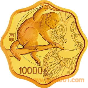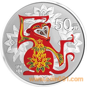 以下4枚金銀紀念幣背面圖案均為中國民間傳統(tǒng)裝飾猴造型襯以吉祥紋飾(局部彩色),并刊面額及“丙申”字樣。