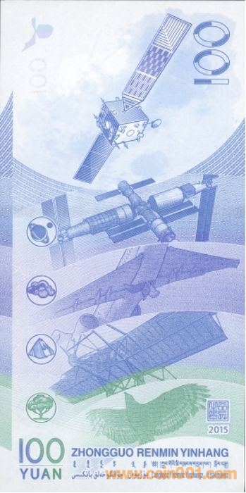 中國航天紀念鈔主色調為藍色。正面主景圖案為神舟九號飛船與天宮一號交會對接圖案。左上方為國徽圖案、“中國人民銀行”行名,其下方為東方紅一號衛星圖案。票面左下方為面額數字“100”和漢字“壹佰圓”。主景圖案右側為嫦娥一號衛星圖案,其上方為面額數字“100”和“中國航天紀念”字樣。背面主景圖案由上至下依次為嫦娥一號衛星圖案、2020年中國空間站“天宮”、噴氣式客機、馮如2號雙翼螺旋槳飛機、飛禽海東青圖案。票面左上角為風箏局部圖案,右上角為面額數字“100”。票面下方為行長章與年號“2015”,中國人民銀行漢語拼音字母和蒙、藏、維、壯四種民族文字的“中國人民銀行”字樣與面額,面額數字“100”,漢語拼音字母“YUAN”。
