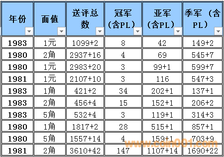 普制長城幣評級難度排序與早期分幣難度排序有明顯的區別,為了能體現難度系數的準確性和科學性在計算時考慮的因素相對要復雜一些,主要參考了評級的總數,均值比(送評總數),冠亞季軍總數,均值比(冠亞季總數)等數據作為計算的主要依據,同時各個均值段的補償方法也比較復雜