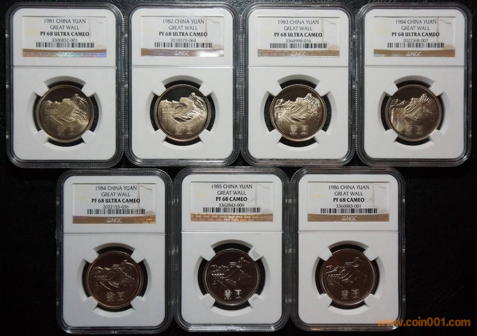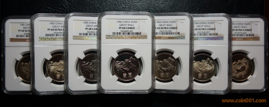 大學畢業以后,雖然自己錢幣收藏的方向有所轉變,但是自己對于精制長城套幣的感情從未減少。精制長城主幣一元是長城套幣中最重要的一枚也可以說是整套幣的靈魂所在。前一段時間本人正好幸運湊齊了一套NGC評級全同68分的81到86的精制長城主幣一套,其中81、82、83、84沈陽、84上海主幣一元為PF68UC級,85、86主幣一元為PF68CA級。由于鑄幣技術的原因,85、86精制一元主幣很難評到PFUC級,實在難以達到同分同后綴的境界。不過86年主幣一元PF68CA已經是目前當之無愧的冠軍幣王了。長城幣雖然在茫茫的現代幣收藏中算不上是最珍貴的錢幣,但是在我心里永遠大愛長城幣!