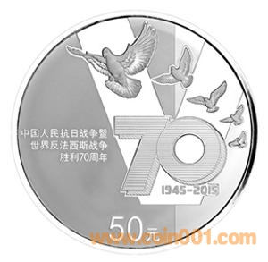 155.52克(5盎司)圓形銀質(zhì)紀(jì)念幣背面圖案為“V”字造型與和平鴿、數(shù)字“70”與時間“1945-2015”共同組成標(biāo)志性符號的組合設(shè)計,并刊“中國人民抗日戰(zhàn)爭暨世界反法西斯戰(zhàn)爭勝利70周年”字樣及面額。