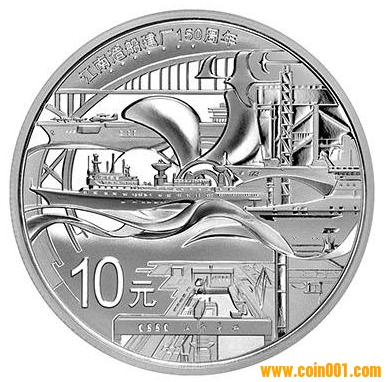 31.104克(1盎司)圓形銀質紀念幣背面圖案為江南長興造船基地船塢、龍門吊及所造艦船、盧浦大橋、螺旋槳等造型組合設計,并刊“江南造船建廠150周年”字樣及面額。
