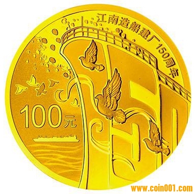7.776克(1/4盎司)圓形金質紀念幣背面圖案為數字“150”構成的船體及鴿子、彩帶、氣球等造型組合設計,并刊“江南造船建廠150周年”字樣及面額。