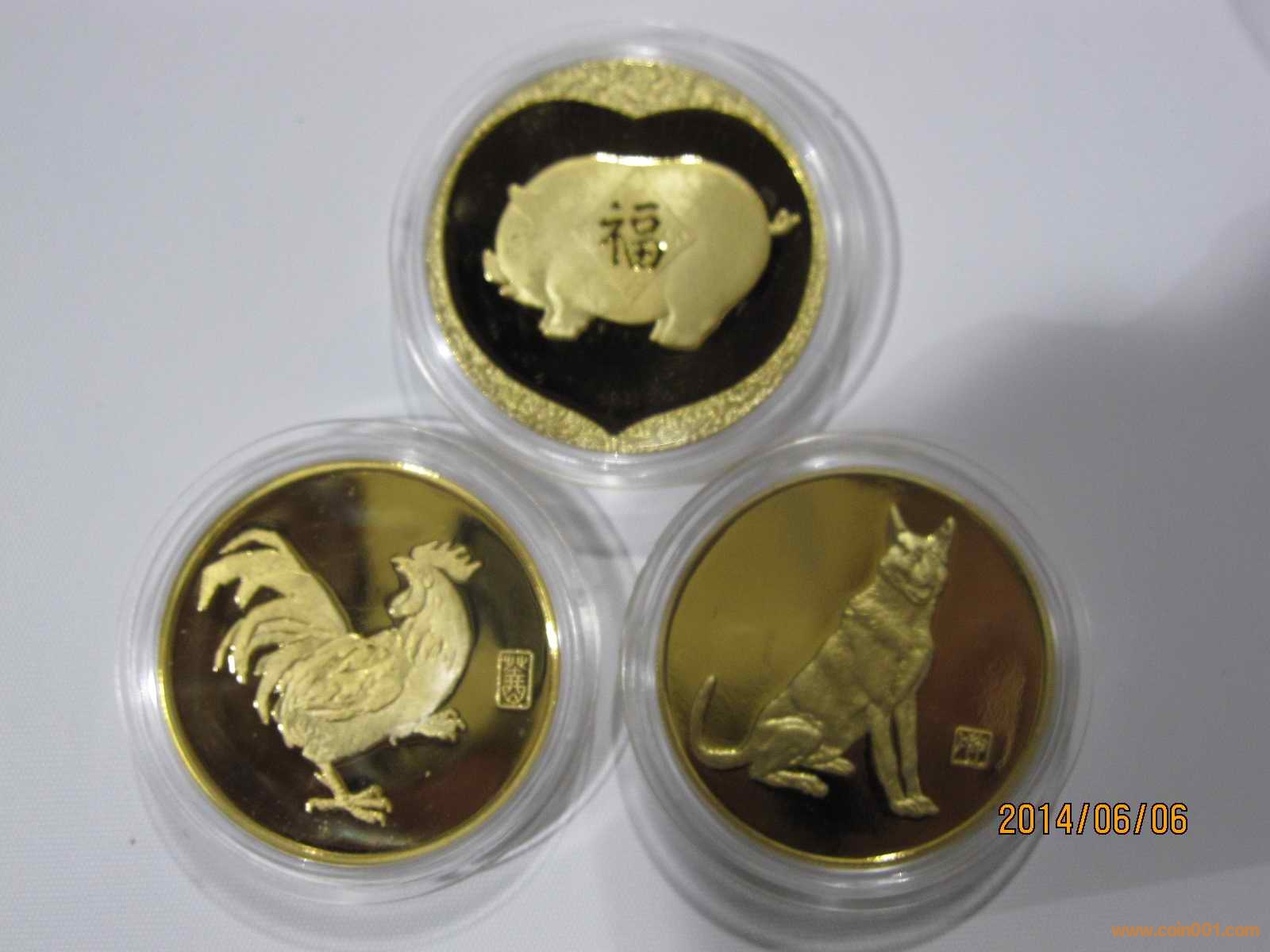 67號是長灘錢幣展正式對外開放的第一天,現代錢幣網的洛杉磯版主王承熾也來現代錢幣網的展臺前幫忙。王版主說有一位美國幣商有不少小章,讓我一起去看看。我便興致勃勃的和王版主一同前往。一看這位美國幣商,原來是老朋友了,他一直來中國參加錢幣博覽會,我在中國也和他有過交易,在他的展臺里確實放了不少的幣章,見圖5,6,7 。其中有三枚生肖章讓我眼前一亮。這三枚章直徑33mm,鍍金精制。關鍵這三枚章都是錯配,其背面的圖案都是用的其他生肖章的圖案,之前在國內從來沒有發現,是3個新的品種,見圖8,9。經過交涉以后幸運拿下,算是一個大收獲。除此以外,這位外國朋友還有整版的一輪生肖雞,原盒的宮燈龍鳳、武財神,還有幾枚罕見的大銅章。