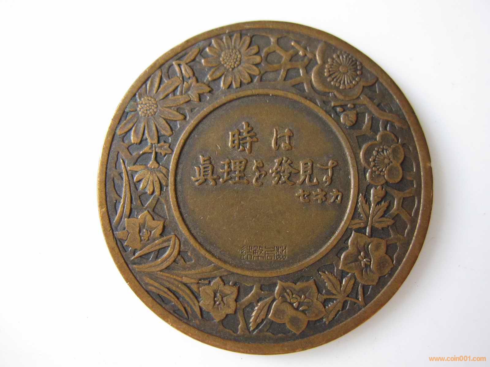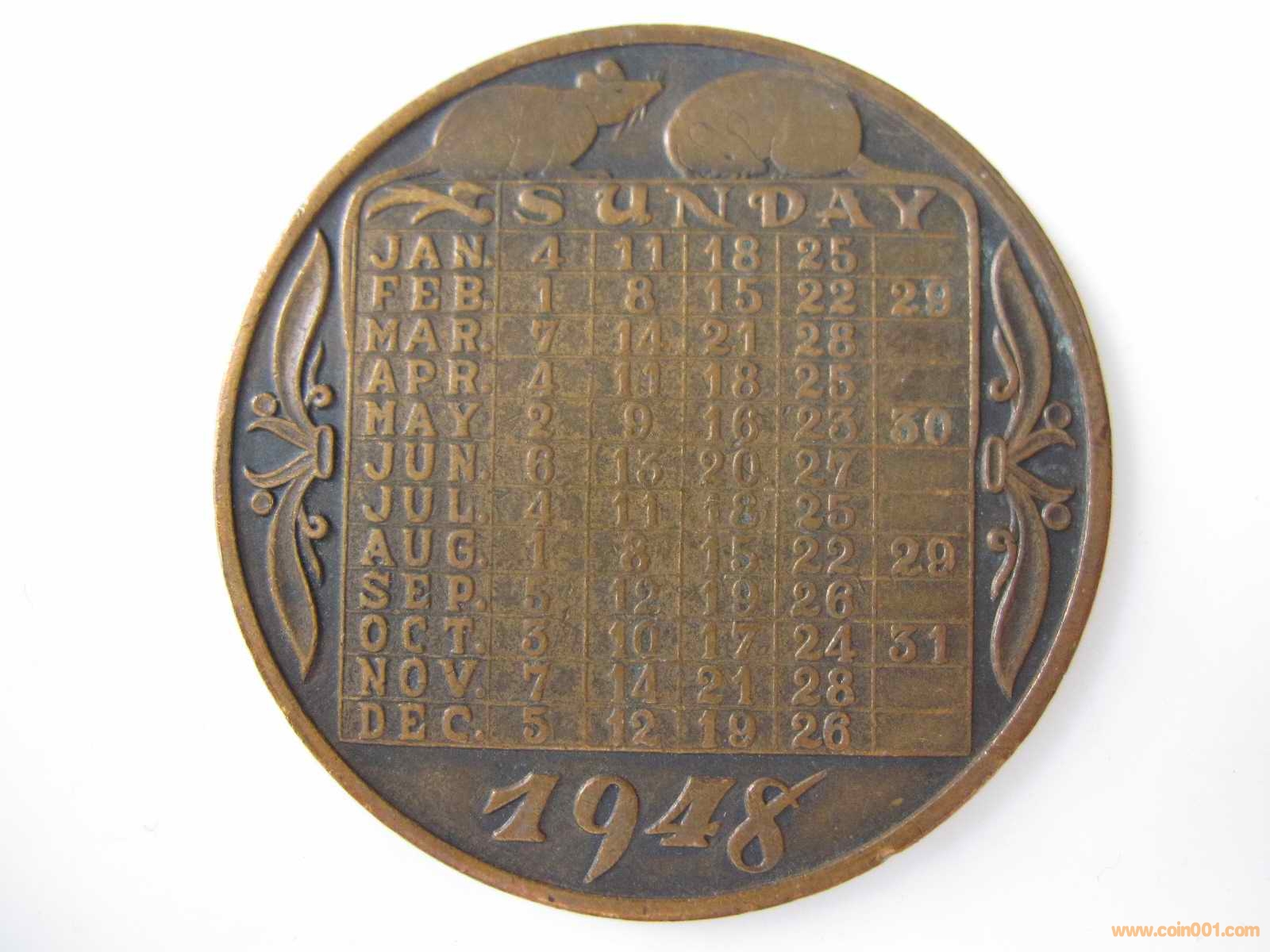 66號下午,我們中國代表團一行來到展會,開始布展。美國的錢幣展有慣例,在正式對外開放的前一天,是參展方的內部交流。在布置完現代錢幣網的展臺以后,我就開始在會場里挨家挨戶的尋找我喜歡的藏品。美國市場里中國的藏品,以金銀幣、熊貓和老幣為主,流通硬幣和中國的章不是很多,逛了半天,也沒有看到什么特別喜歡的藏品。突然走到一位專門做外國章的攤位前,有一枚日本的小章讓我產生了興趣,見圖3,4 。這枚章正面寫的是“時間可以發現真理”,反面是日歷,是日本造幣局于1948年鑄造的。中國最早的出現日歷的小章,據我所知是1982年的生肖狗。其實很多早期中國近代章,是學習了其他國家的設計思路,經過多年的演變,形成了中國現在特有的章牌藝術。在正式展會的前一天能收獲此章,也算是有小小的收獲了。