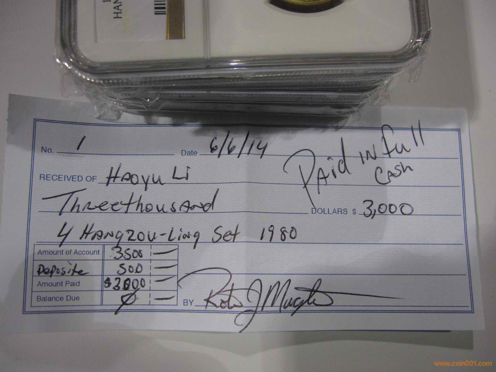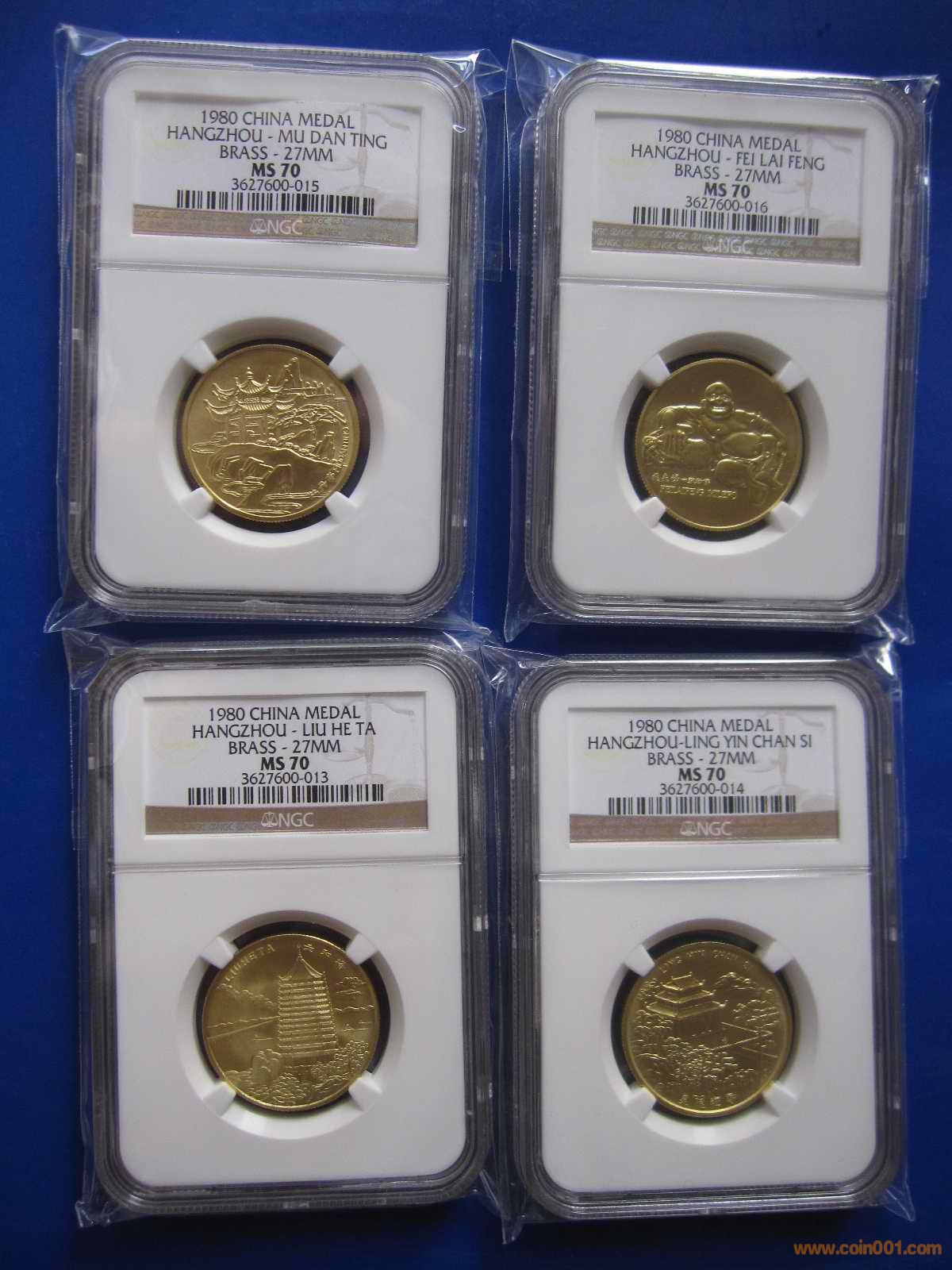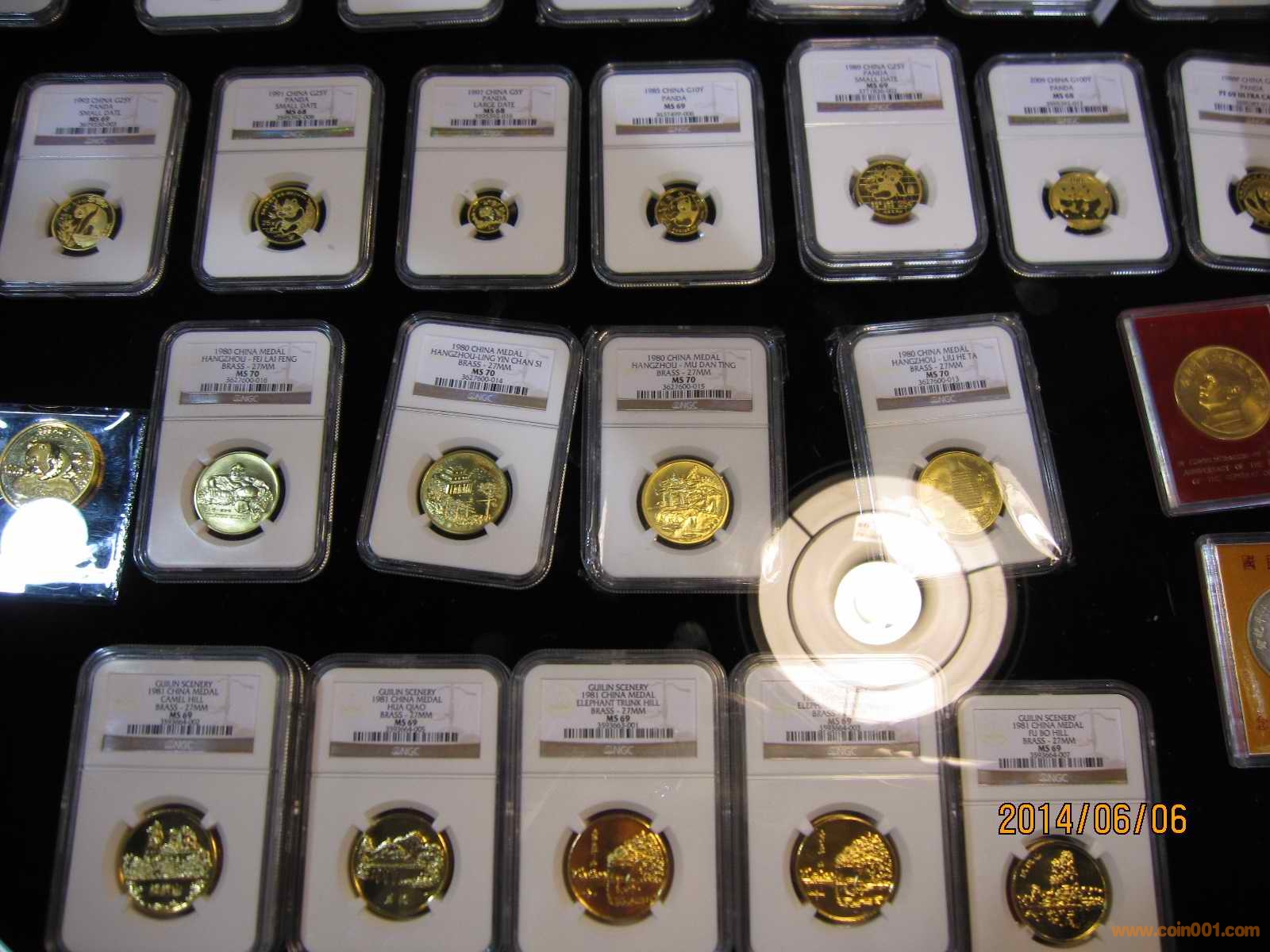 吃過中飯以后,我又在市場里逛,在走到會場中間的一個展臺時,我被眼前所看到的章給震驚了。我看到了一套1980年上海造幣廠鑄造的杭州風景紀念章,4枚都是NGC評級,并且4枚都是MS70滿分。這套章,在我們收集小章的圈內,一直是奉為“傳說中的章”,我們只在早期的兩本圖錄上看到過照片,從來沒有看到過實物。此次驚現美國,實屬緣分。這位美國幣商還評級了不少的中國其他章,見圖10。我便上去詢問杭州風景的價格,他盡然問我是不是要一枚一枚購買?我很驚訝的告訴他,這是一套,拆開賣就不值錢了,我要4枚一套一起買。美國幣商看看我,對我說3500美金一口價。這個價格真是不低啊,基于此套是僅見品,又都是MS70滿分,我二話不說,就拿下了,見圖11-14。我身上實在沒有攜帶這么多美金,先付了500美金定金,回去籌錢。我和老孫問了白冰和陳浩敏,他們由于在前一天內部交易用了很多錢,身上現金也不多了,實在難以支持,還說要是從國內匯款十分麻煩,可能還要走地下錢莊,風險很大。在我心急如焚之際,我突然想到了貓王袁雄,他經常在國外交易,從國外幣商手里買了不少熊貓珍品,他一定有辦法匯款給我。我便聯系了袁老,袁老得知我見到罕見珍品,需要幫助,二話不說就把錢轉了過來,還再三詢問是否要多轉一些,讓我真是感激萬分。中國轉款到美國需要2,3天,我很擔心賣家會不會有變故。這時老孫想起了一個人物,美國的錢敏。他在美國做生意,手里美元一定充裕,我們便去錢敏那里先搞了3000美金,把杭州風景章拿了下來。我買回以后,給同行的朋友們看,無論是做金銀幣的還是特許經銷商都贊嘆早期銅章的工藝之高,4枚普制銅幣(章),能同時評到70分滿分的實屬罕見。80年代的早期銅章在國內要賣十幾人民幣一套,這對于當時的國人來說是天價,買的人極少,那時在國外還會有人買。同時早期的銅章也會贈送給早期收購中國金銀幣的幣商。金銀幣老外都會當回事保留下來,隨著中國的不斷發展,購買力不斷提高很多已經回流。但是早期的銅章,很多老外都不當回事,很多都送人或者丟失。可以說早期銅章的回流更難。收藏玩的就是驚喜和心跳,回憶起來充滿了刺激和喜悅,也許這就是收藏的魅力!