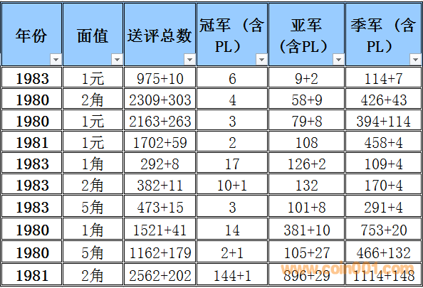 普制長城幣評級難度排序與早期分幣難度排序有明顯的區別,為了能體現難度系數的準確性和科學性在計算時考慮的因素相對要復雜一些,主要參考了評級的總數,均值比(送評總數),冠亞季軍總數,均值比(冠亞季總數)等數據作為計算的主要依據,同時各個均值段的補償方法也比較復雜 首先我們需要討論評級幣的價格構成 評級幣的價格構成 裸幣的價格+評級溢價+評級費用=評級幣的參考價格 主要可以參考以下2個因數, 第一個因素為裸幣本生的價格(它的價格變動主要依據裸幣成交價格的變動而變動與評級溢價之間的關系不大) 舉例來說: 裸幣的價格上漲1倍評級難度系數沒有變化的話,評級幣的價格應該相應的上漲1倍+溢價+評級費用=評級幣的參考價格,裸幣的價格的上漲只能帶動評級幣裸幣部分的上升,裸幣價格下跌,評級難度系數沒有變化的話,評級幣的價格為裸幣下跌的價格+溢價+評級費用=評級幣的參考價格,裸幣的價格的下跌只能帶動評級幣裸幣部分的下跌 第二個因素為評級難度所產生的一個溢價 難度系數越高它對應的溢價就越高。溢價變化主要依據評級難度系數與系數平均值的變化和對比來決定,溢價水平的上升在一定的程度上會提升高品質裸幣的價格(卷光卷拆的硬幣)和品相的稀缺性,裸幣價格的下跌,如果評級難度提高的話評級幣的價格反而有可能會上升,從以上的結果可以得出下列結論,溢價是評級價格體系當中最重要的組成部分,溢價和裸幣的價格體系完全是獨立的,之間的價格沒有直接的聯系 備注:關于這個數據的準確性在設計這個表的時候我已經考慮到了一個重評的可能性所以我只取冠,亞,季軍作為一個參考并同時設計了一個補償方案,重評從時間和金錢的角度來衡量的話不是非常經濟且還存在一定的風險,但是從長遠看不能排除這個因數。雖然將來會產生一些誤差,但我認為誤差不會太大尤其在高分段和稀缺性的錢幣,對于普制長城幣來說NGC已經作為收藏的主流其數據的準確性還是比較值得信賴的。 采樣的范圍 取樣范圍:1980-1985 普制長城幣 難度排序的選擇標準:送評總數的平均值高于100%的普制長城幣,低于100%的數據將不體現在難度排序中 計算公式: 評級總數/均值=均值比 考慮到1983年長城幣存世量明顯低于其他年份的普制長城幣,1983年的數據將保留和計入到難度排序中,大家可以通過下面的圖表黃色部分發現被刪除的年份主要是送評溢價不高的年份,如果未來送評量穩步上升的話,它將加入到采樣的范圍. 備:這個采樣的范圍會有一定的誤差,我將根據均值比的變化每個季度第一周進行適當的調整,由于普制長城幣的版別比較復雜,無法進行細分這里主要以年份為主,請大家諒解! 采樣的數據和計算的依據 統計第一檔次每個年份冠,亞,季的出分數量作為一個分析依據,為了能更加的量化我用數字的方法進行統計,方法如下: 調整后的均值比 普制長城幣的計算方法如下: 綜合值的計算方法: (送評總數均值比+冠亞季總數均值比)÷2=綜合值 具體計算方法如下: 均值比在0-50% 冠軍分1枚為1分2枚2分以此類推,亞軍分1枚為2分2枚4分以此類推,季軍1枚為3分2枚6分以此類推 補償方法如下: 如果冠軍分的評分數量大于總數(冠,亞,季之和)的15%,冠軍分的1枚為1.5分,如果冠軍分的評分數量大于總數(冠,亞,季之和)的50%冠軍分的1枚為2分 如果亞軍分的評分數量大于總數(冠,亞,季之和)的35%,亞軍分的1枚為2.5分,如果亞軍分的評分數量低于總數(冠,亞,季之和)的25%亞軍分的1枚為1.5分 季軍分的評分數量大于總數(冠,亞,季之和)的65%,季軍分的1枚為2.5分, 季軍分的評分數量大于總數(冠,亞,季之和)的85%,季軍分的1枚為2分 均值比在50-100% 冠軍分1枚為1分2枚2分以此類推,亞軍分1枚為1.5分2枚3分以此類推,季軍1枚為2分2枚4分以此類推 此范圍+值補償 如果冠軍分的評分數量大于總數(冠,亞,季之和)的50%冠軍分的1枚為1.25分 如果亞軍分的評分數量大于總數(冠,亞,季之和)的35%,亞軍分的1枚為1.75分 均值比在100-150% 冠軍分1枚為0.5分2枚1分以此類推,亞軍分1枚為1分2枚2分以此類推,季軍1枚為1.5分2枚3分以此類推 補償方法如下: 如果冠軍分的評分數量大于總數(冠,亞,季之和)的15%,冠軍分的1枚為0.75分,如果冠軍分的評分數量大于總數(冠,亞,季之和)的50%冠軍分的1枚為1分 如果亞軍分的評分數量大于總數(冠,亞,季之和)的35%,亞軍分的1枚為1.25分,如果亞軍分的評分數量低于總數(冠,亞,季之和)的25%亞軍分的1枚為0.75分 季軍分的評分數量大于總數(冠,亞,季之和)的65%,季軍分的1枚為1.25分, 季軍分的評分數量大于總數(冠,亞,季之和)的85%,季軍分的1枚為1分 均值比在150%-180% 冠軍分1枚為0.5分2枚1分以此類推,亞軍分1枚為0.75分2枚1.5分以此類推,季軍1枚為1.25分2枚2.5分以此類推 如果冠軍分的評分數量大于總數(冠,亞,季之和)的15%,冠軍分的1枚為0.62分,如果冠軍分的評分數量大于總數(冠,亞,季之和)的50%冠軍分的1枚為0.75分 如果亞軍分的評分數量大于總數(冠,亞,季之和)的35%,亞軍分的1枚為1分,如果亞軍分的評分數量低于總數(冠,亞,季之和)的25%亞軍分的1枚為0.5分 季軍分的評分數量大于總數(冠,亞,季之和)的65%,季軍分的1枚為1分, 季軍分的評分數量大于總數(冠,亞,季之和)的85%,季軍分的1枚為0.75分 均值比在180%以上 冠軍分1枚為0.25分2枚0.5分以此類推,亞軍分1枚為0.5分2枚1分以此類推,季軍1枚為0.75