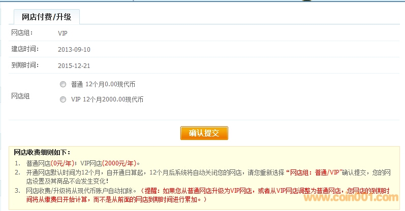 3、網(wǎng)店收費/升級將從現(xiàn)代幣賬戶自動扣除。(提醒:如果您從普通網(wǎng)店升級為VIP網(wǎng)店,或者從VIP網(wǎng)店調(diào)整為普通網(wǎng)店,您網(wǎng)店的到期時間將從繳費日開始計算,而不是從前面的網(wǎng)店到期時間進行累加。)