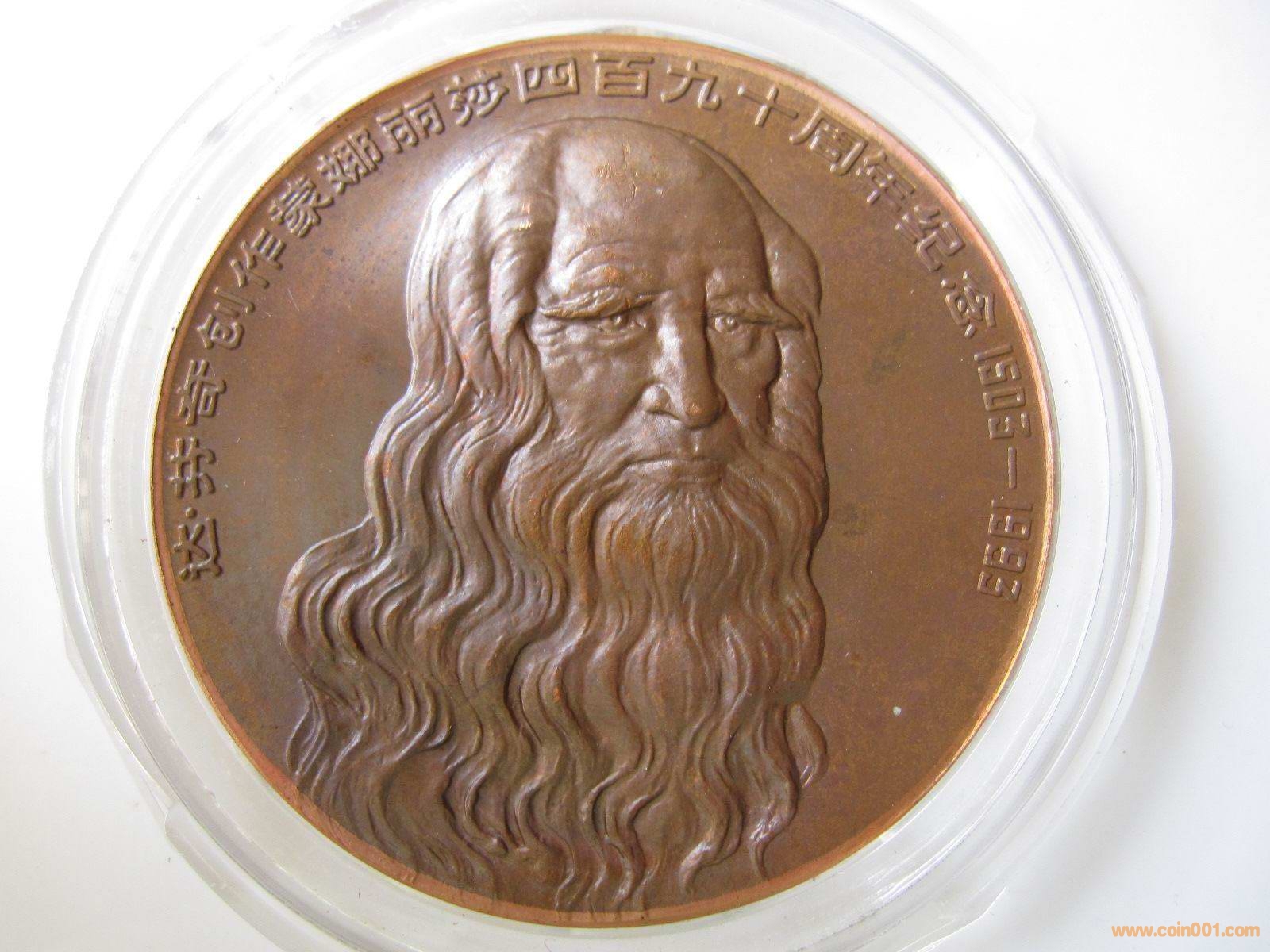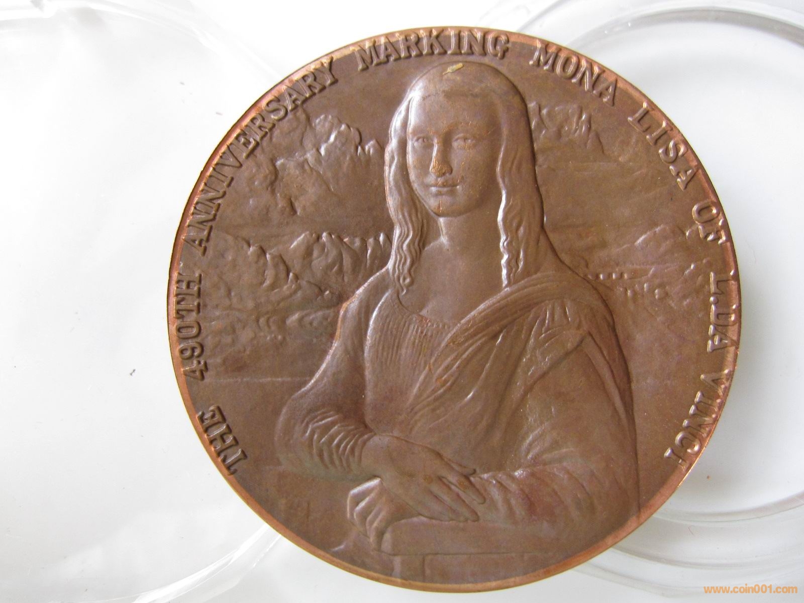 回到那天的盧工地攤,除了這枚章以外,還有一枚達芬奇創作蒙娜麗莎四百九十周年的章十分吸引我。話說普通的這枚章很常見,只有300多元的價格,但是地攤上的這枚章確十分的特別,在章的最外面有一圈很均勻的淺顏色環,見圖8,9,10 。這讓我感覺到有些蹊蹺,一問價格,只有小幾百,毫不猶豫的買下了。回家以后,我和我原來的一枚達芬奇章對比了一下,發現顏色明顯較淡,見圖11 。對于最外圈光亮的一圈百思不得其解。我便把照片發給幾位大銅章的老前輩詢問,結果都不知原因。一個月以后,北京孫老師來滬和我一起去上幣學習,我把這枚達芬奇章帶去,請幾位上幣的專家鑒賞,在幾位專家仔細查看了許久之后,他們得出了統一的結論。此枚達芬奇章,是用老坯餅做的,在沖壓之前,做了一道光邊的工藝,這個和流通硬幣的工藝一樣。老坯餅原來就有氧化,光邊之后把內部沒有氧化的內心翻出,然后再沖壓,就形成了邊緣一圈均勻的淺色紫銅本色。然后這枚章也沒有經過最后的上色處理,就直接流出來了,他們猜想是造幣廠內部職工手里的東西,類似于未上色的半成品。第二天上幣的專家還拿出了光邊的圖紙讓我們看,我們進一步了解了光邊的工藝。經過這么一解釋,籠罩在我頭上一個多月的疑團解開了,同時還學到了造幣廠的工藝,真是受益匪淺。
