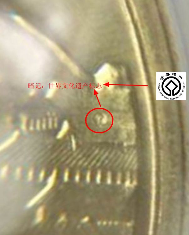 除了本身設(shè)計漂亮外,遺產(chǎn)幣還有特殊的防偽措施,在正面外環(huán)的上、下、左、右四處,帶有微雕文字,世界文化遺產(chǎn)的拼音;同時,每一枚幣,還在不同位置置入了暗記,世界文化遺產(chǎn)的標志(見下圖,麗江古城幣的防偽暗記),整套幣的防偽性極高。