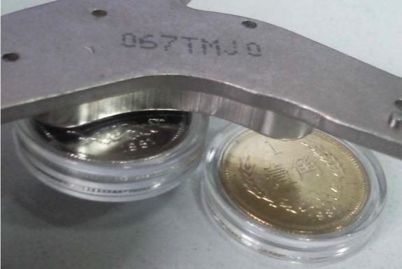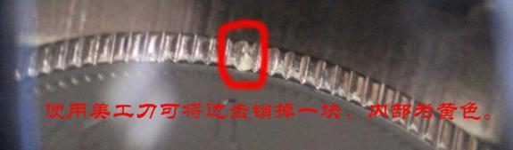 使用美工刀對銀色幣一個邊齒進行切削,將邊齒削掉一塊,使用10倍的放大鏡對切削部分進行觀察,發現內部為黃銅色,并且邊齒較容易切削,可以判斷邊齒材料非鐵或鎳,初步判斷為銅幣鍍鎳。為了進一步驗證其內部材料,使用150倍的放大鏡對切削處進行觀察,可以很明顯地看出表面鍍層與內部銅質的分界面。如圖所示. 見第五張圖片