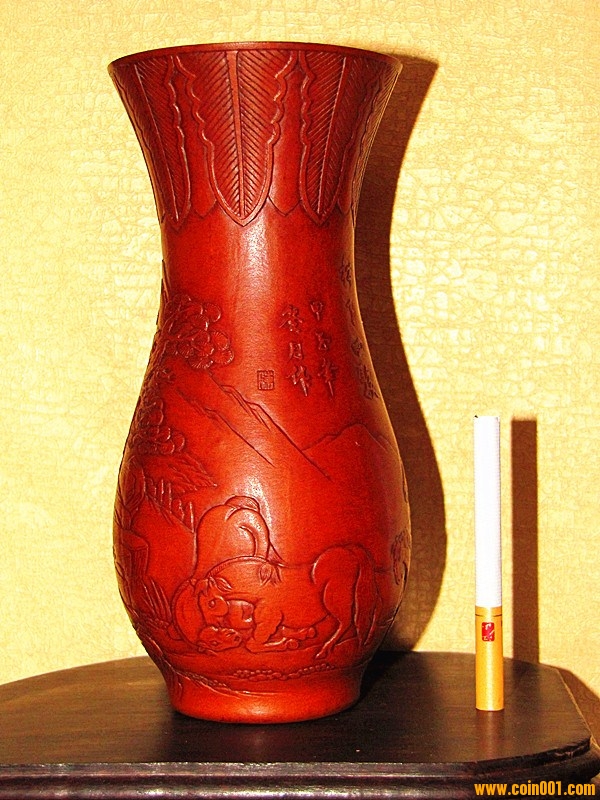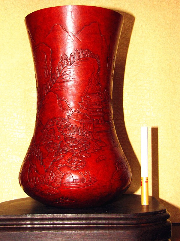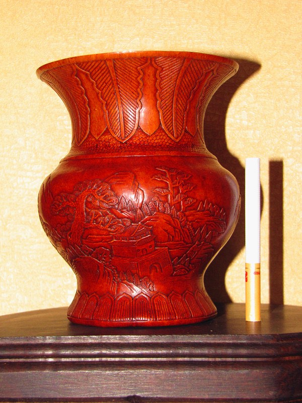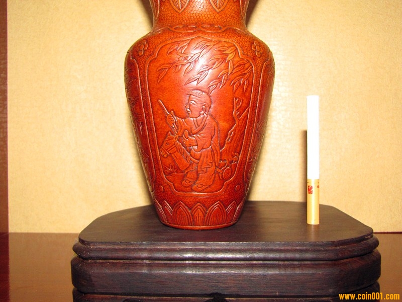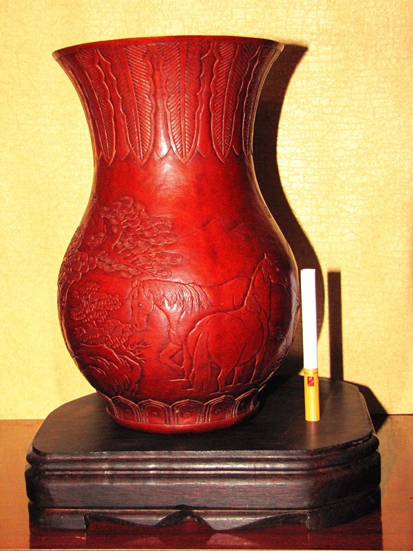 現在所見實物有少量帶"康熙賞玩"款識的,但真正形成流派,名家輩出,還是在晚清民國時期。其制作過程一般先要雙鉤物象草稿,再持刀沿邊線按壓出呈斜面的凹溝,兩側凹陷,則中間紋飾即凸顯而出。高手還能在很小的限度內區分高低、深淺、虛實,層次分明。實際上,花紋并未高出表皮,這種欲陽先陰的意匠,極為巧妙。道光時徐某、近代天津陳錦堂等精通此技。押花葫蘆首先是圖案的組織,一把完整的押花葫蘆無論從哪個角度看,都是一副精美的山水,盛花鳥魚。其次是雕刻的技法,因為是淺浮雕,既要有層次感,有立體感,又要不能傷皮。因此要用瑪瑙刀一遍一遍的押、砑、趕、擠、按葫蘆表面,使之呈現浮雕花紋。線條要流暢更要有傳統藝術的韻味。葫蘆造型要以圖案匹配,這樣創作的作品深得海內外人士喜愛。
