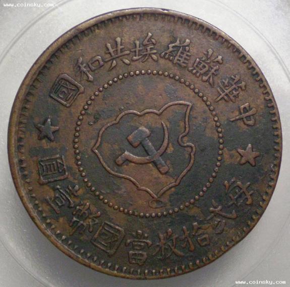 1931年11月在江西瑞金縣洋溪村正式建立了中央造幣廠,鑄造銀幣和銅幣。銅幣有:五分無島、遠島、近島、連島、套島及一分六種版別;銀幣面值為貳角、有1932年和1933年2種版別。1932年版因鑄造數(shù)量少、發(fā)行時間短,存世稀少!它是我黨發(fā)行的第一套國幣,又稱‘蘇區(qū)幣’,1934年10月中央紅軍主力撤離跟據(jù)地開始長征。中華蘇維埃共和國國家銀行隨紅軍長征,即停止發(fā)行貨幣,中央造幣廠也停止鑄造。蘇區(qū)幣鑄造和流通僅兩年多,時間很短,數(shù)量很少。紅軍北上后,國民黨及其它反動勢力,對中央蘇區(qū)進行多次清剿,蘇區(qū)貨幣大部被毀,老區(qū)百姓俗稱‘紅軍幣’,藏在房梁上、墻縫里或用油布、羊皮包好用泥土做成磚胚狀保留下來,也有的怕遭無故連累而自行銷毀,經(jīng)過數(shù)十年的滄桑歲月,磨損消耗,能夠有幸保存下來的已寥寥無幾,尤如鳳毛麟角,紅軍幣是革命戰(zhàn)爭的歷史見證、珍貴的革命文物。它對新中國的建立以及革命的勝利起了巨大的推動作用,它是中 國 共 產(chǎn) 黨領(lǐng)導(dǎo)中央蘇區(qū)軍民進行政治、軍事、經(jīng)濟斗爭的歷史見證,在中國貨幣史上占有相當(dāng)重要的地位。