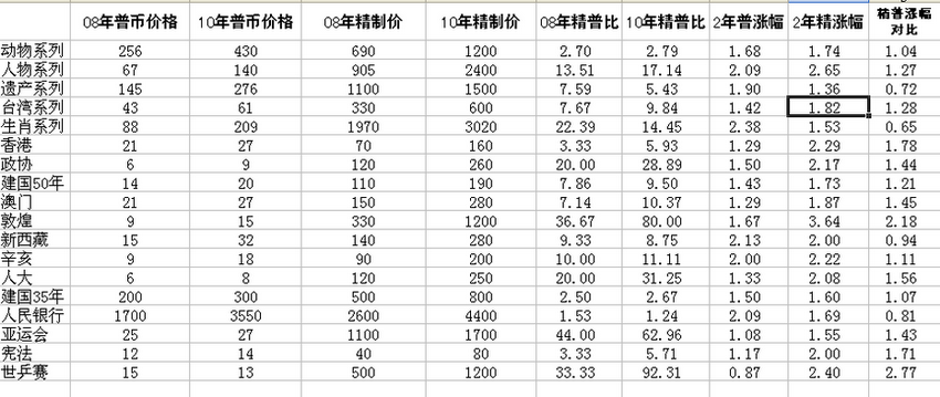 從這個表可以看出08年 到10年精制幣與普制幣的價格變化
