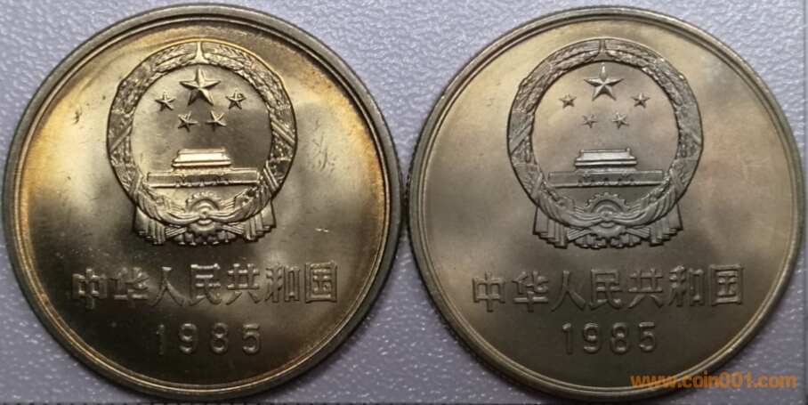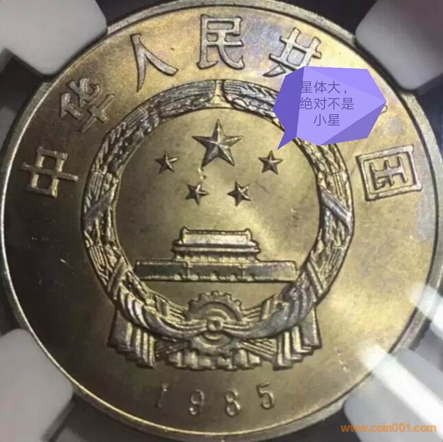 3、 流通普制紀念幣,現發現的大小星版別唯一存在于1985年西藏自治區成立20周年普制紀念幣中(俗稱老西藏幣)。如下圖:
