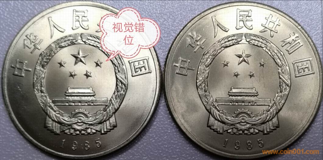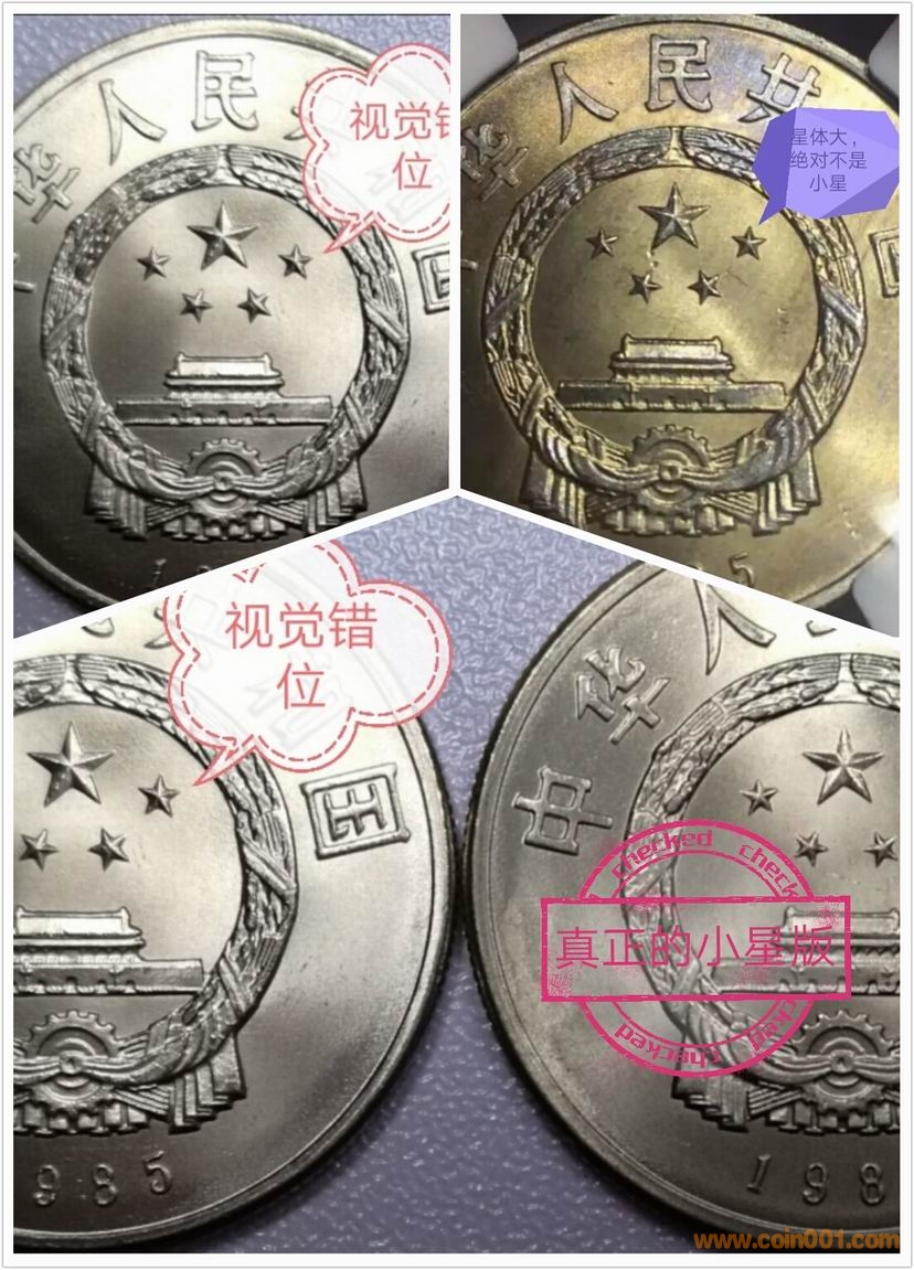 2、 流通硬幣1元長城幣中也存在大小星版,即先前泉友們所慣稱的1985年寬版和1985年窄版。經前期對比測量中發現這兩種長城幣國徽大小也不同,寬版大星的國徽小,窄版小星的國徽大。如下圖:
