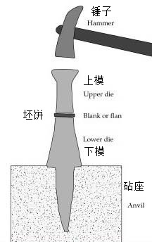 在這種手敲造幣的作業中,下模一般有一個尖尖的長“根”,以便將其敲入一個用作基座的樹樁或大木塊上加以固定。上模要直接承受榔頭的沖擊,損耗比下模要快2-3倍。幣模損耗以后必須重做,因此上模的圖案就比較簡單,用在幣的反面。而下模因為損耗較慢,圖案可以做得比較復雜,用在幣的正面。這就是下模往往用來壓印幣的正面的由來。這些模子用來直接造幣,可看作是工作模(working die)。