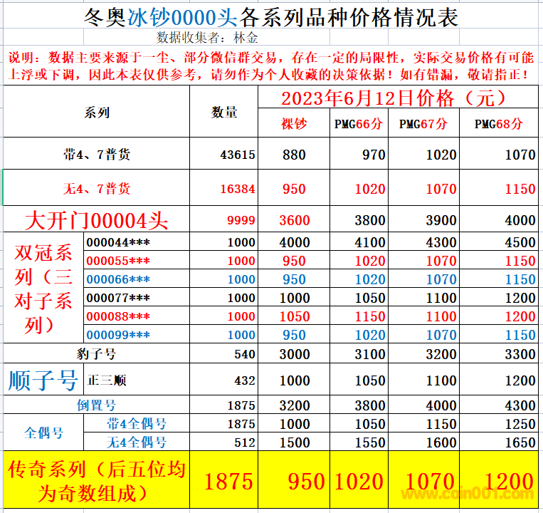 冬奧冰鈔0000頭各系列品種價格情況表(2023年6月12日)