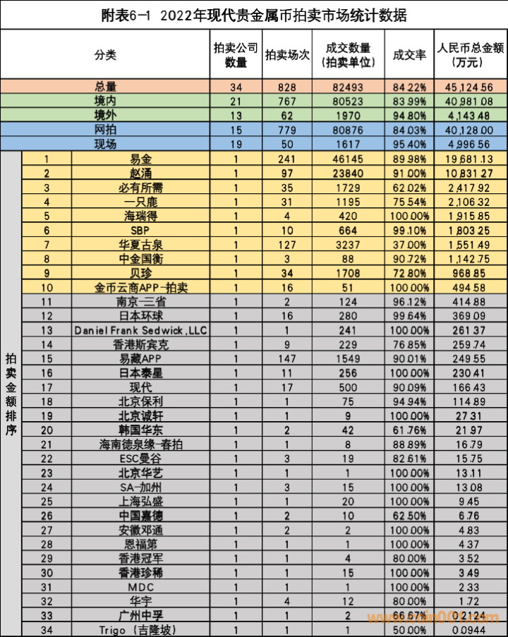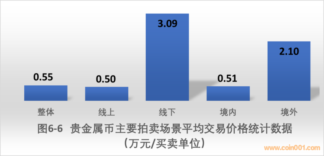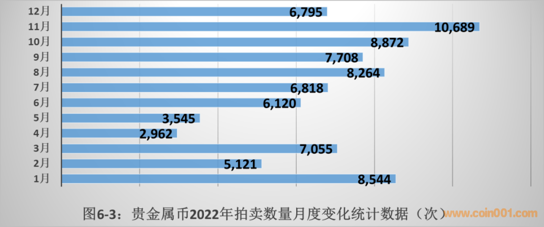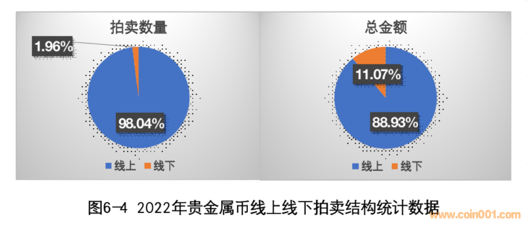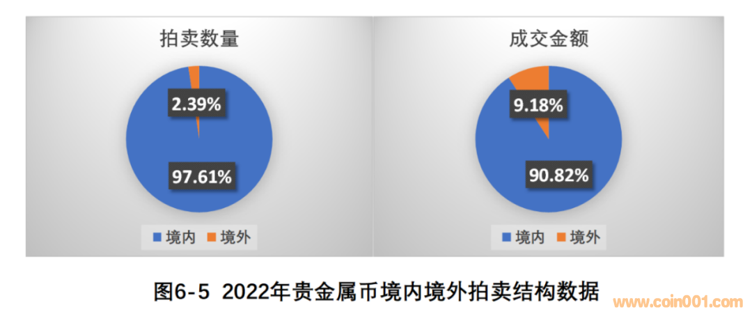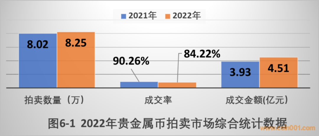 在服務市場的拍賣市場中,盡管受到疫情的一定影響,但經營者努力克服疫情造成的困難,2022年共計實現貴金屬幣的拍賣總數量8.25萬次,拍賣總金額4.51億元,與2021年相比分別上漲2.88%和14.69%,目前線上和境內拍賣繼續延續絕對主體優勢,為貴金屬幣的市場流通和價值轉換做出重要貢獻。