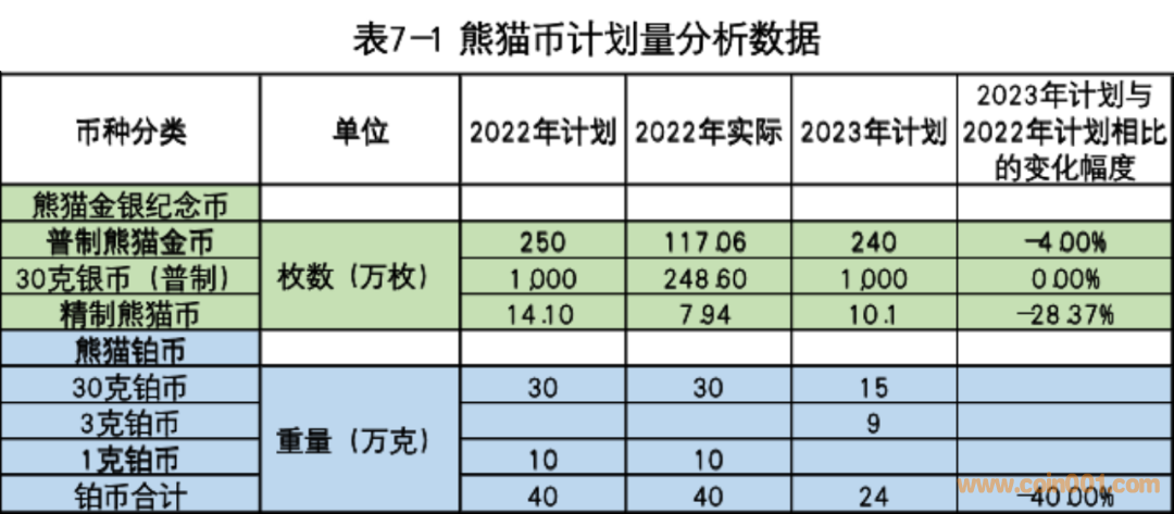 如表7-1所示,熊貓幣2023年號公告量與2022號公告量相比的變化: