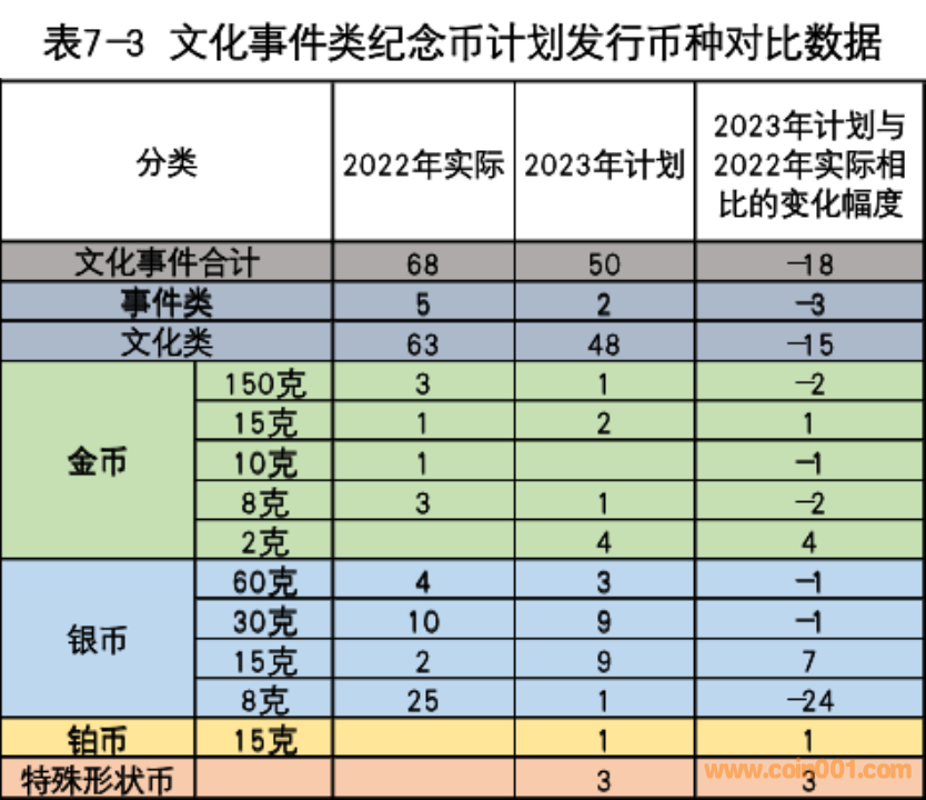 文化事件類紀念幣的發行項目,2023年計劃與2022年實際執行對比的數據見表7-2。(說明:由于“中國空間站建成金銀紀念幣”推遲到2023年1月9日發行,因此將這個項目計入2023年計劃。)