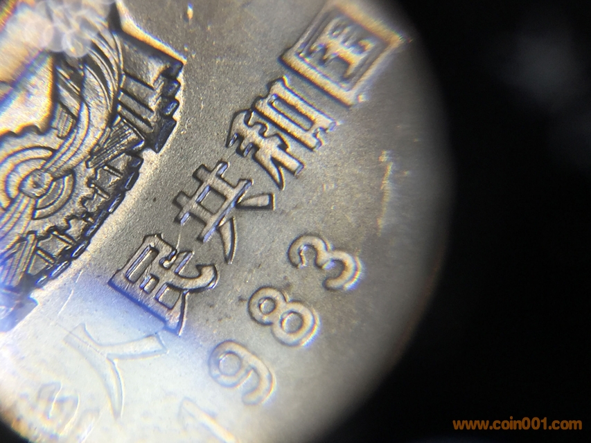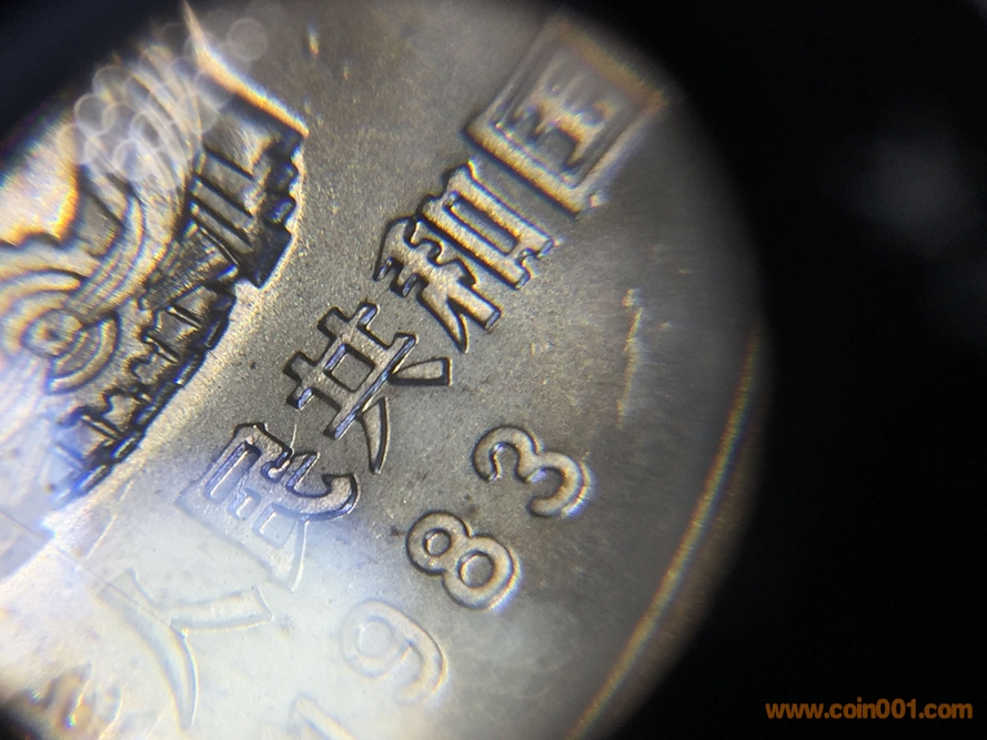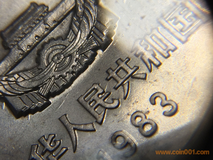 基于上述發(fā)現(xiàn),筆者想提幾個問題:1)“民共相連”本是模裂的一種,這是一種較為常見的壓印錯誤。在長城幣中,模裂的比例比背逆、天坑、多肉等錯鑄要大的多,更廣為人知的就是長城模裂,各式各樣的長城模裂線層出不窮,順便提一句,四層小磚的長城模裂似乎比例更高。但是,除了這枚831之外,“民共相連”目前僅見于無磚801,為何有磚801、普制811、831、851均未見一定比例的“民共相連”?2)我們姑且認(rèn)為“民共相連”是“中華人民共和國”這7個字之間的模裂的一種形式,為何“民共相連”最為常見,而其他5組相鄰的字之間鮮見連體,莫非在壓印民共二字的時候特別容易出現(xiàn)模傷?3)一般的說法是,“民共相連”不僅只見于無磚801,且只見于卷拆801,從未見于本拆801,這又是為何。無磚的壓印質(zhì)量其實整體是比較高的,壓印質(zhì)量相對更差的無磚卻從未見過“民共相連”,這似乎是天然的矛盾。4)模裂本身并不稀奇,但是此前“民共相連”僅見于無磚801的現(xiàn)象無非為這個版別增添了一種神秘感,此枚831“民共相連”的發(fā)現(xiàn)可以說是徹底打破了這一說法。另外,這枚“民共相連”831并非普通的831,這枚幣兩面的鏡面效果都極好,且是國徽深打,有點類粗版的感覺,整體壓印質(zhì)量也比較高,浮雕立體感強,幣面的金屬感十足。這枚幣大概率是早期壓印的831,或者是用特殊模具壓印的831,這就與出現(xiàn)模裂顯得有點矛盾。各種奧妙,到底該如何解釋?