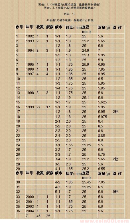 附表:1.《46枚假1元硬幣版別、數據統計分析表》
