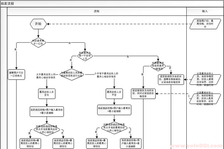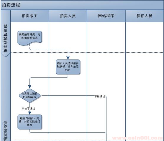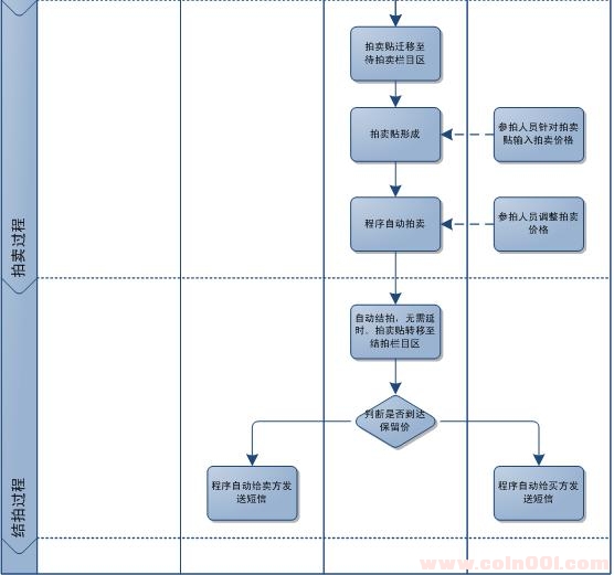 元月十七日開(kāi)始編寫(xiě)《中國(guó)現(xiàn)代錢(qián)幣網(wǎng)拍賣(mài)程序需求規(guī)格說(shuō)明書(shū)》,當(dāng)時(shí)對(duì)于拍賣(mài)程序的了解僅僅局限于我們論壇本身的拍賣(mài)規(guī)則以及國(guó)內(nèi)做的比較好的網(wǎng)絡(luò)拍賣(mài)。先畫(huà)了個(gè)比較泛泛的流程圖。這就是我們網(wǎng)站拍賣(mài)程序的初稿。