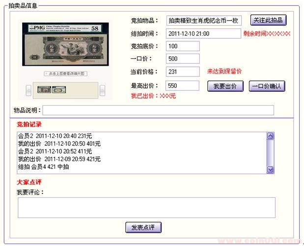 隨著設(shè)計(jì)的深入,一些細(xì)化困難點(diǎn)逐漸呈現(xiàn),如何實(shí)現(xiàn)自動(dòng)出價(jià)系統(tǒng),如何實(shí)現(xiàn)安全出價(jià),什么是最小遞增額,什么是競(jìng)拍底價(jià)、保留價(jià)、一口價(jià), 現(xiàn)代幣的定義與使用,十分鐘延時(shí)制度的優(yōu)化。所有想不到的問(wèn)題都一一仔細(xì)考慮與解決,凝結(jié)著大家的智慧。經(jīng)常夜晚10點(diǎn)多、早上七八點(diǎn)網(wǎng)站版主都在激烈討論。這里我還得佩服老孫,很多想法與實(shí)現(xiàn)都是他多年奮戰(zhàn)在各大拍賣(mài)會(huì)現(xiàn)場(chǎng)總結(jié)出來(lái)的經(jīng)驗(yàn)與心得,再結(jié)合國(guó)內(nèi)外家喻戶(hù)曉的網(wǎng)絡(luò)拍賣(mài)平臺(tái)特點(diǎn),形成了中國(guó)現(xiàn)代錢(qián)幣網(wǎng)獨(dú)具特色的拍賣(mài)過(guò)程。設(shè)計(jì)再次細(xì)化,形成程序偽代碼設(shè)計(jì)。