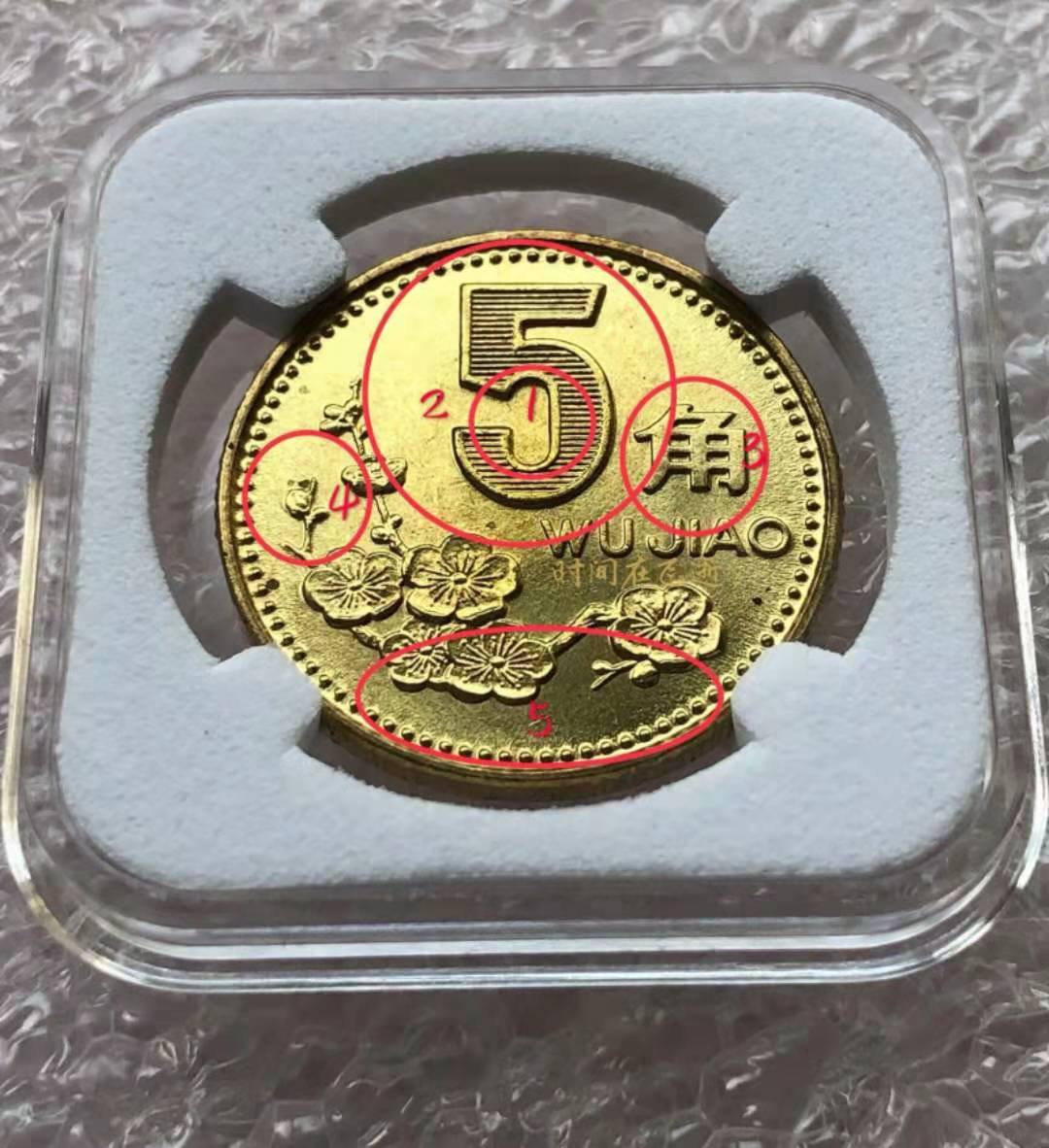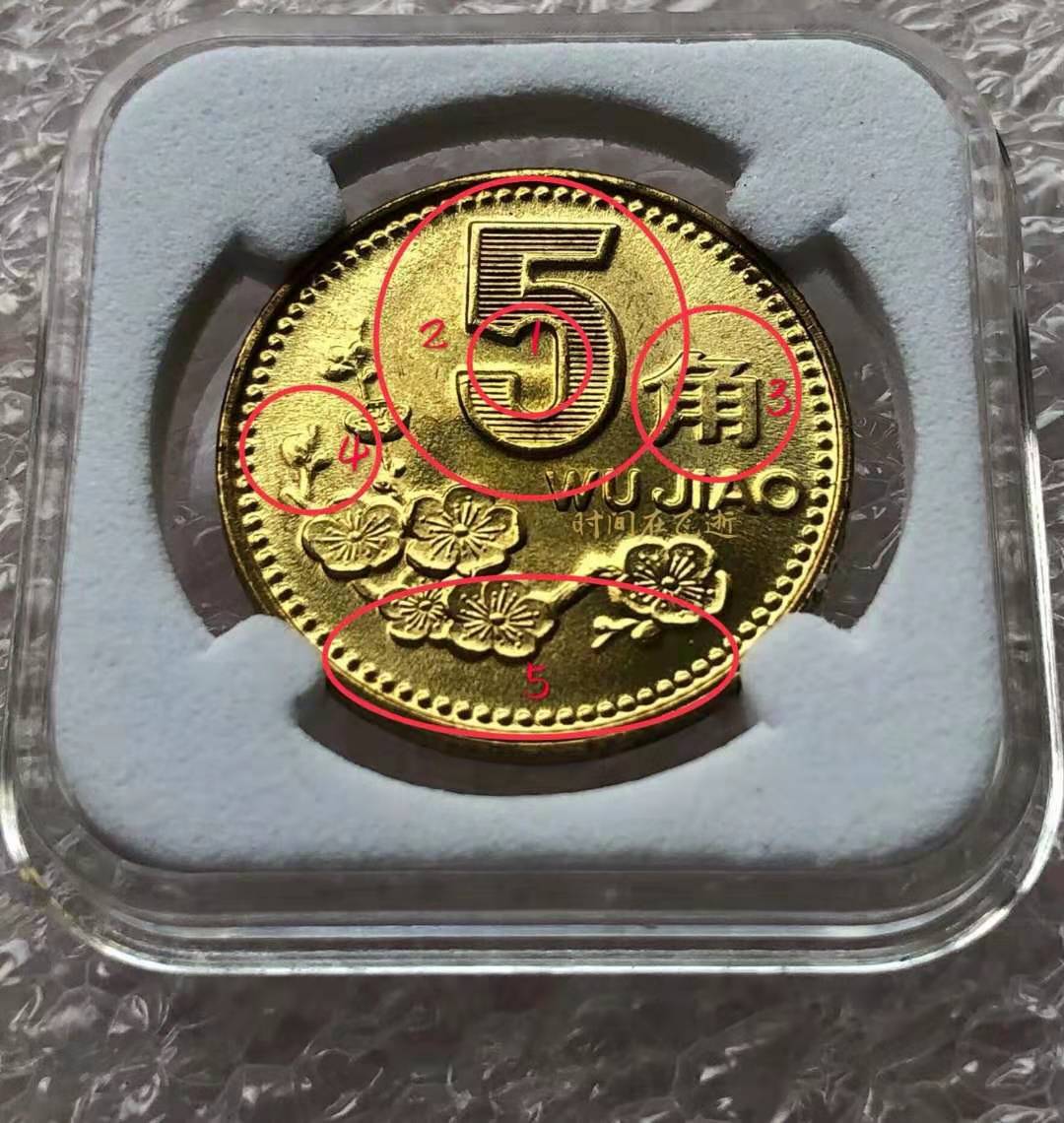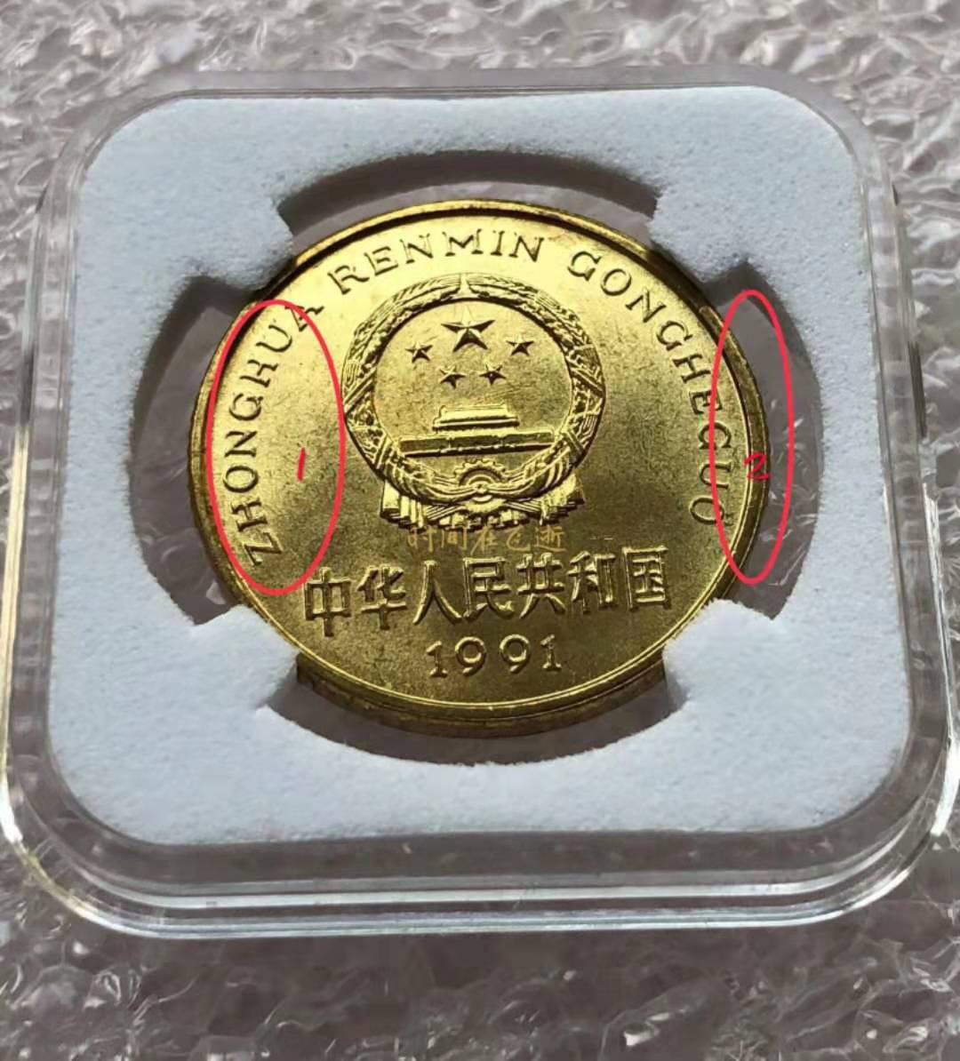 (2)國徽面1代表:“拼音的粗細對比”。2代表:“幣邊緣的沖壓痕跡對比”