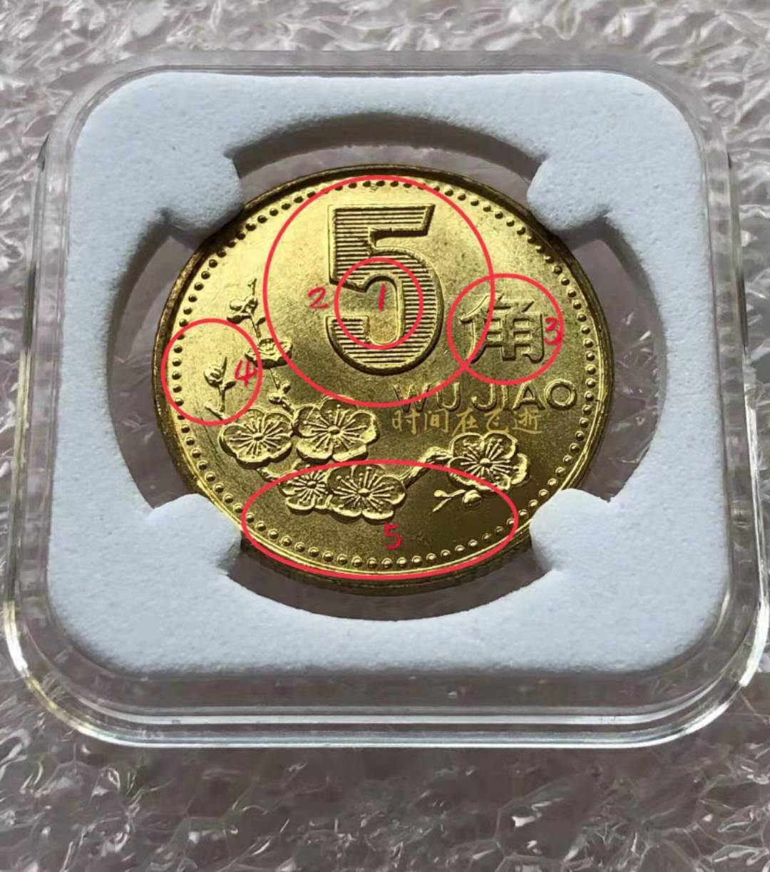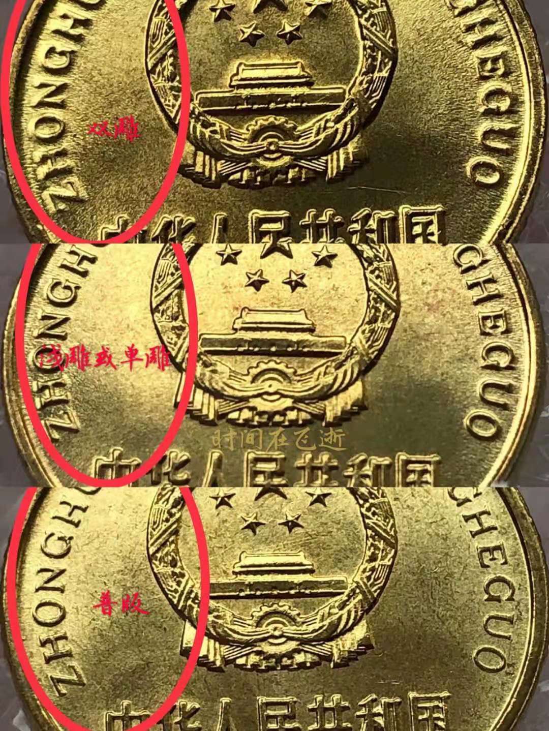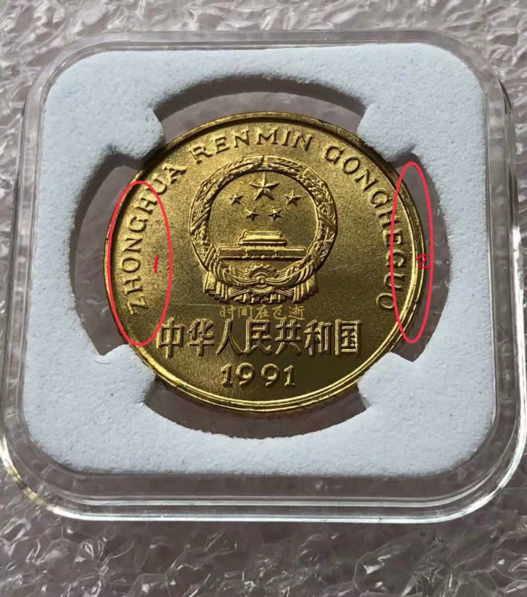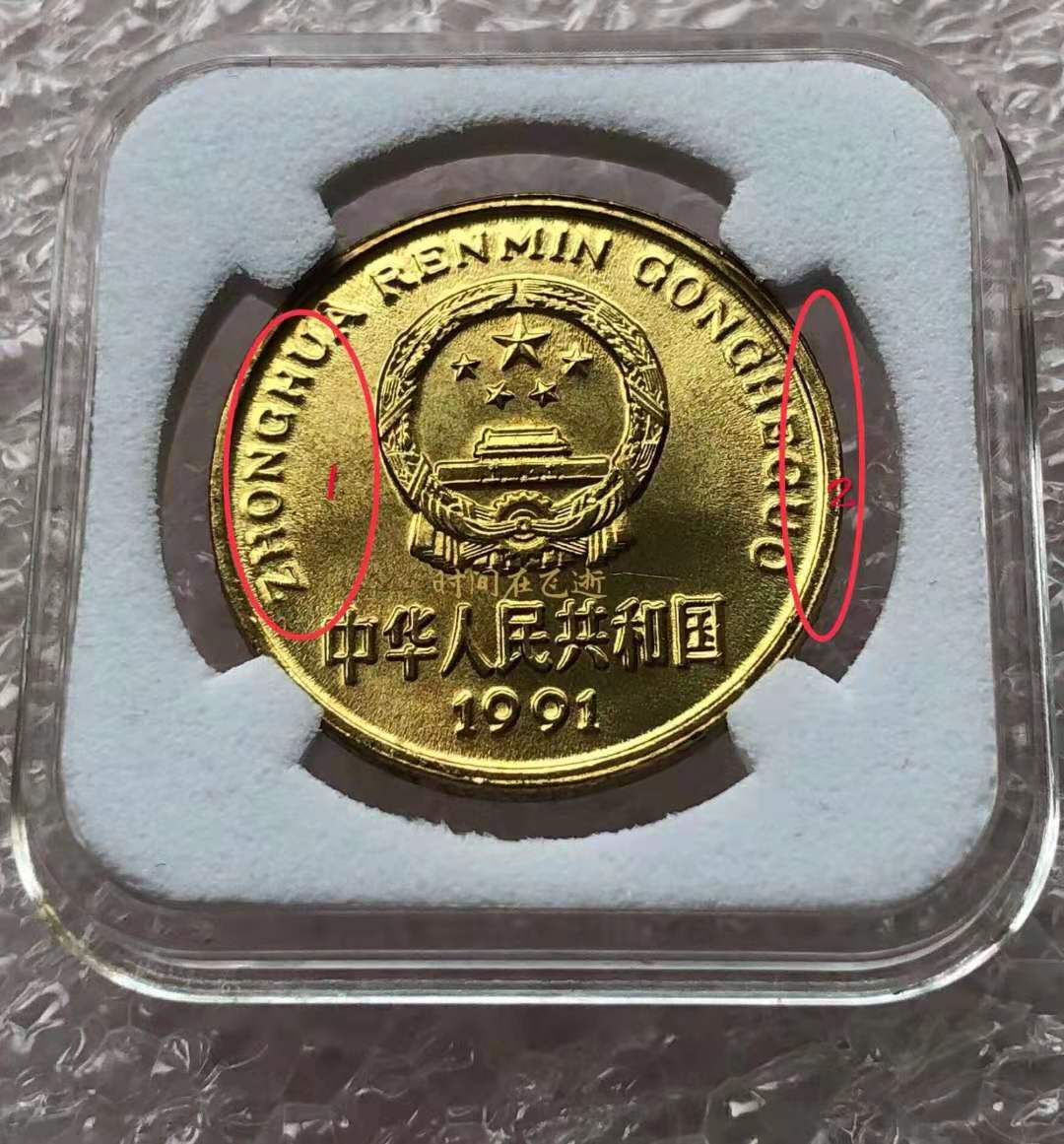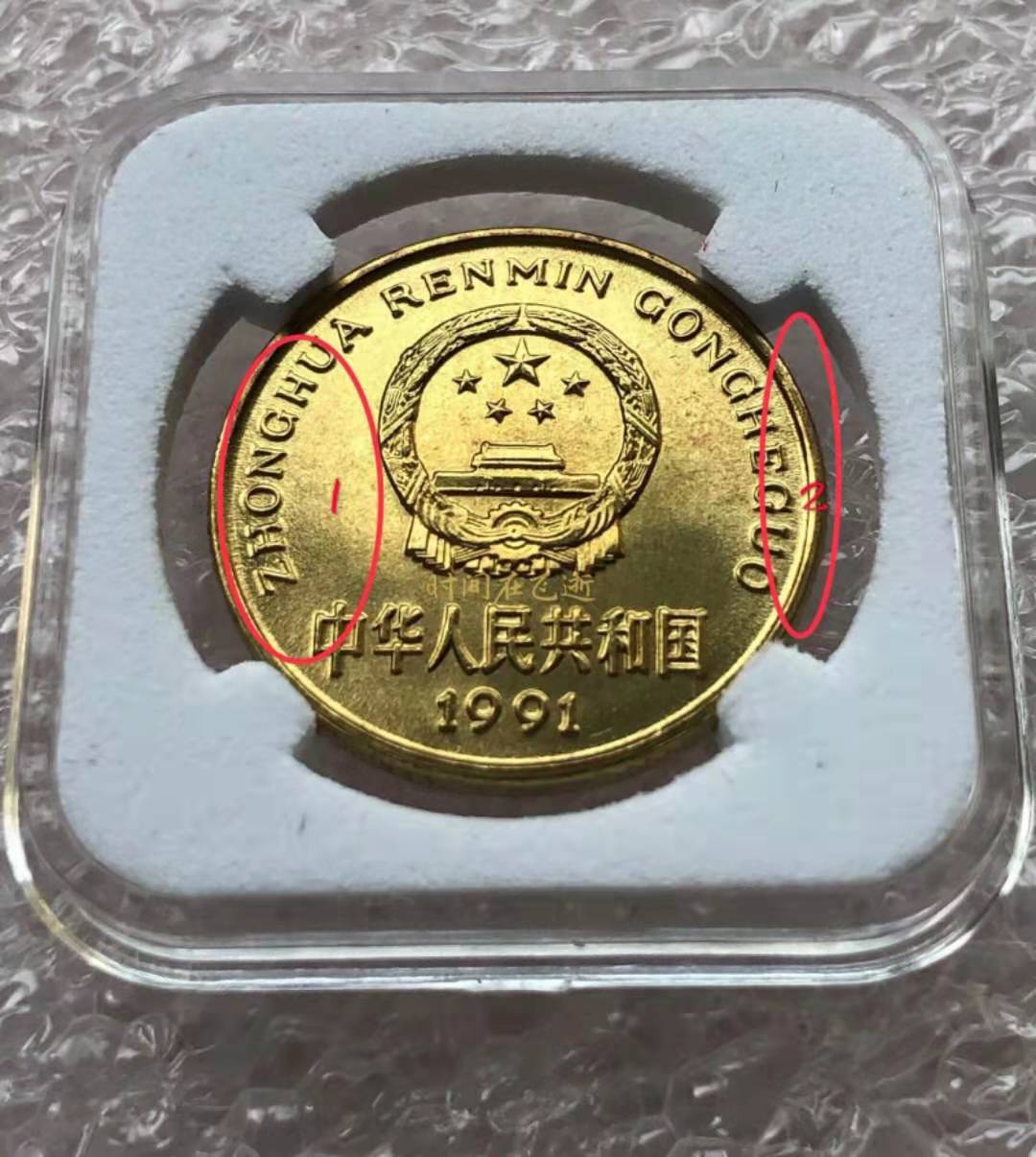 [backcolor=transparent](2)國徽面1代表:“拼音的粗細對比”。2代表:“幣邊緣的沖壓痕跡對比”
