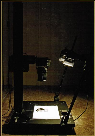 光源位置 - 一般情況下,光源應該在正對錢幣的位置,這是為了避免錢幣上出現陰影,掩蓋細部圖案。如果錢幣水平放置,那么光源就應該在錢幣正上方。但相機的最佳位置通常也在正對錢幣的位置,因此光源幾乎和相機在一個方向上。這就要求相機離錢幣較遠,因為相機太近會遮擋光線,妨礙照明。所以拍攝錢幣時不是相機離錢幣越近越好,