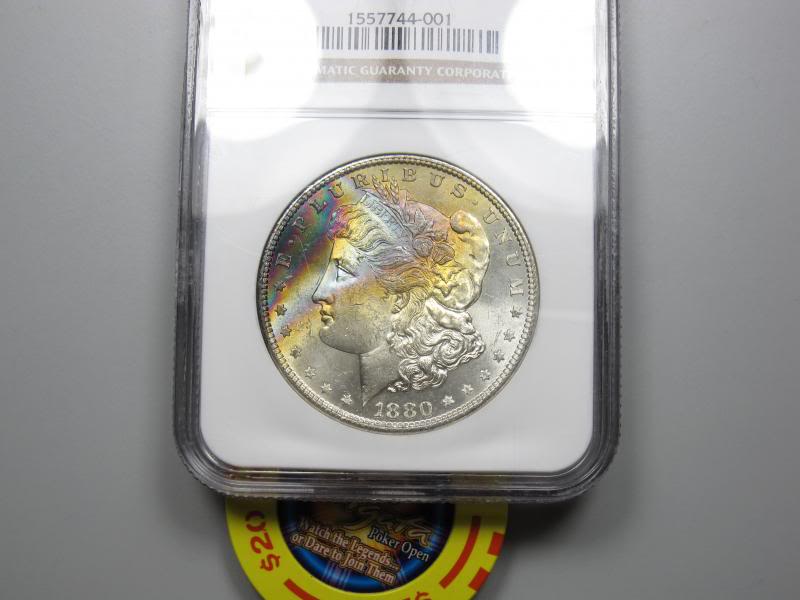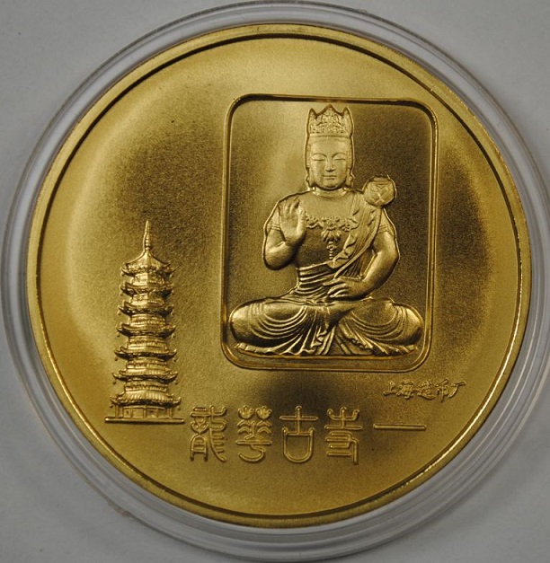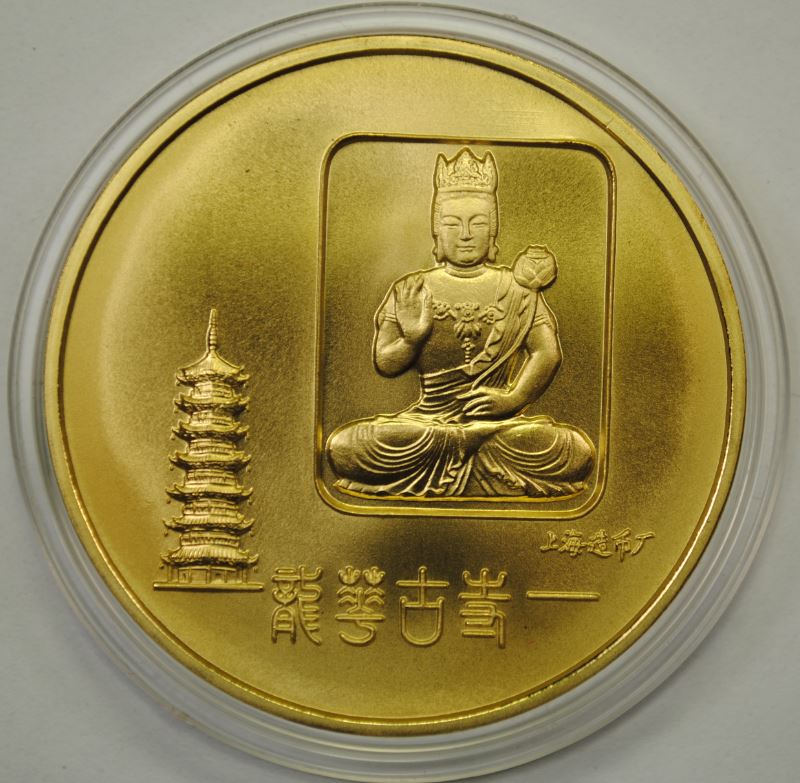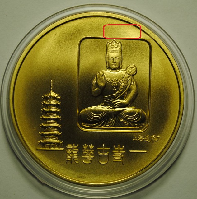 另外如果錢幣或評級盒上有掃痕和發絲痕,要注意光源的照射方向和絲痕的方向一致。如果光源和絲痕成90度夾角,絲痕的反光會很強烈,從而夸大這些缺陷。以下是龍華寺銅章的圖片比較。第一張中光源和絲痕成九十度。絲痕明顯。第二張中光源在章的左右兩側,絲痕消失。