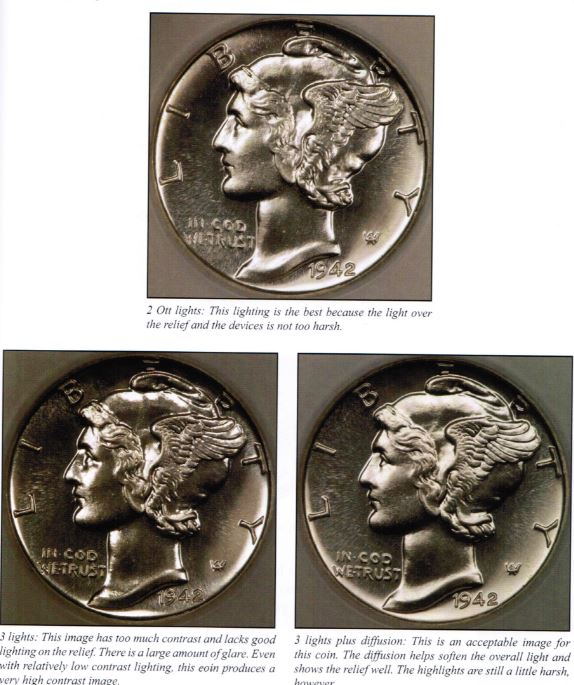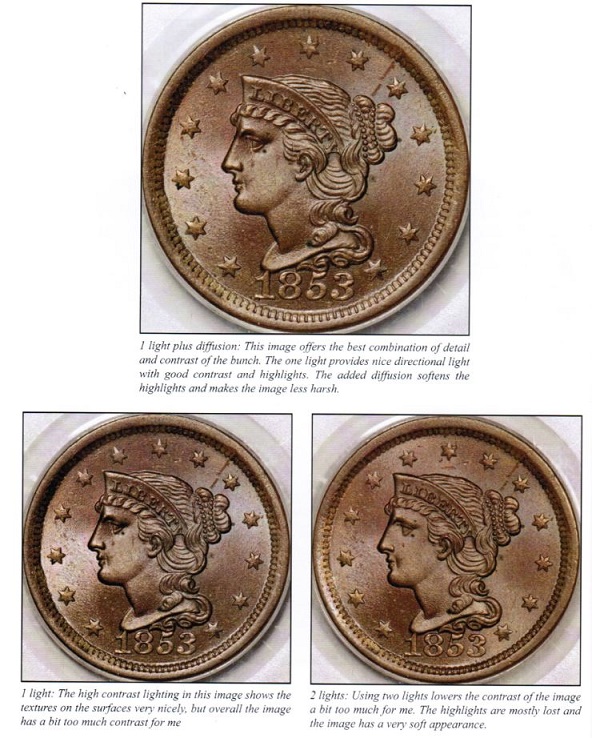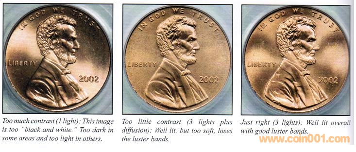 拍攝一枚錢幣時首先要確定其對比度,這樣才能適當配置燈光。錢幣的對比度和燈光對比度要相互協調。高對比度的錢幣應配低對比度的燈光,這樣才能減少反光,顯出細節;而低對比度的錢幣要配上高對比度的燈光才能增加生氣,避免黯淡。比如說高對比度的鏡面精制幣最好配上低對比度的條形日光燈或加了柔光效果的三盞白熾燈。Mark Goodman尤其提到要避免精制幣鏡面部分呈現黑色,因為這樣會掩蓋幣面細節部分。
