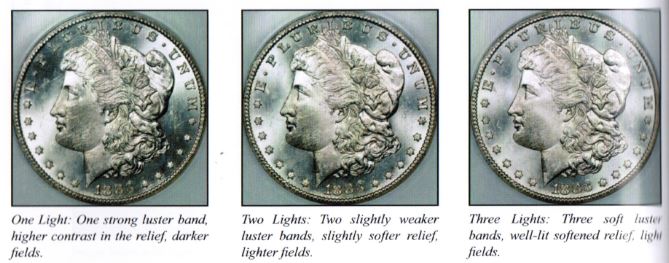 如果有一個以上光源,其放置的位置也有講究。兩盞白熾燈應該放在幣的10點鐘和2點鐘方向,這樣在有車輪光的幣上會形成兩條對稱的光帶。三盞白熾燈的放置位置應該是10點鐘、12點鐘和2點鐘。